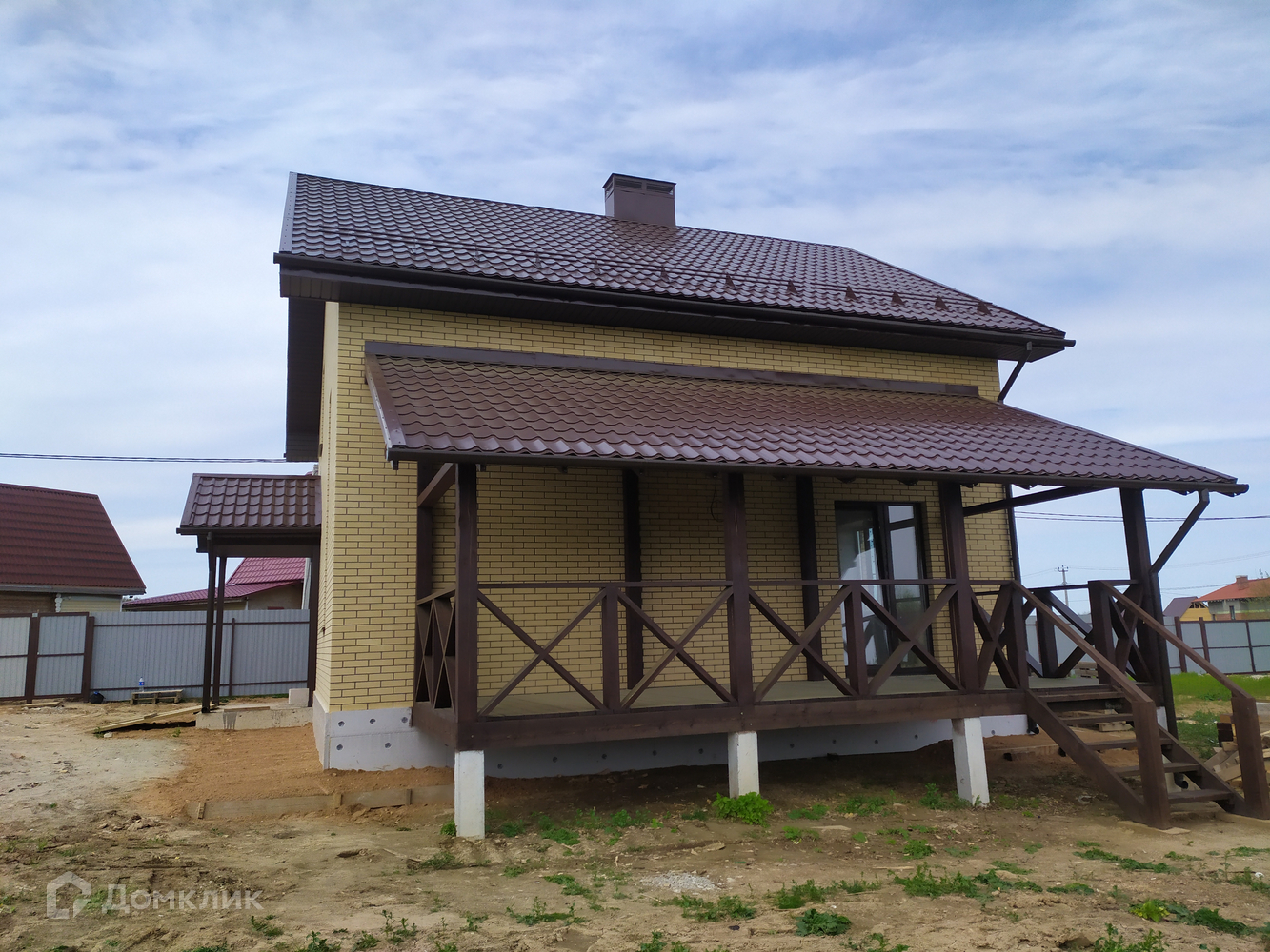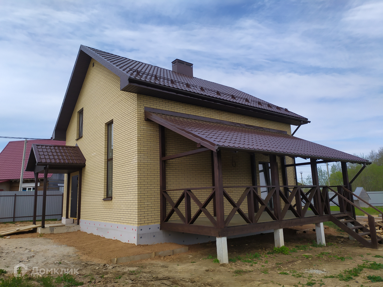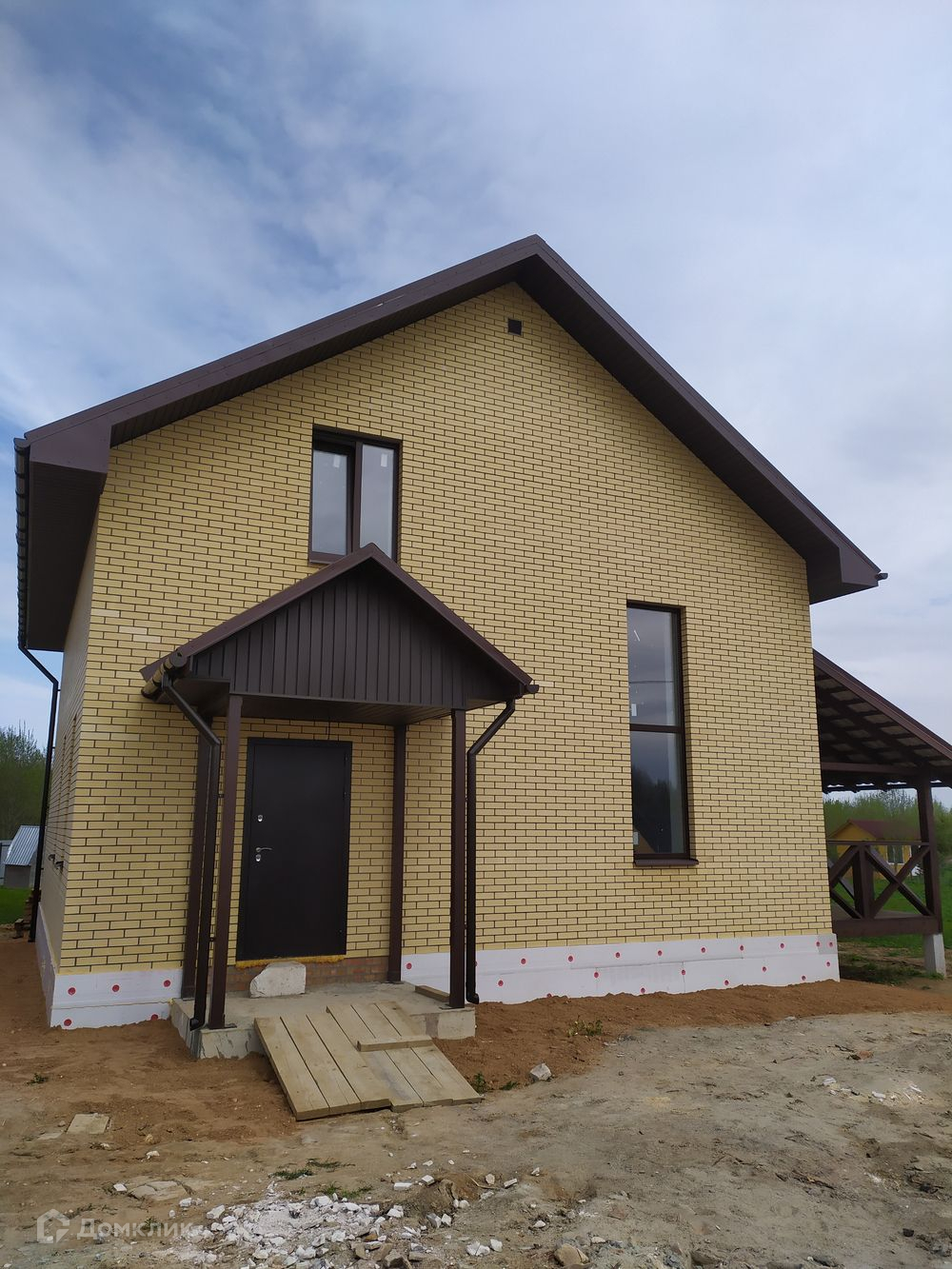 Фундамент - ж/б сваи, ростверк, стены пенобетонный блок 375 мм, облицованный керамическим кирпичом, крыша - металлочерепица, перекрытия ж/б, крыльцо, патио с выходом из кухни-гостиной, внутри оштукатурен, стены подготовлены под чистовую отделку.