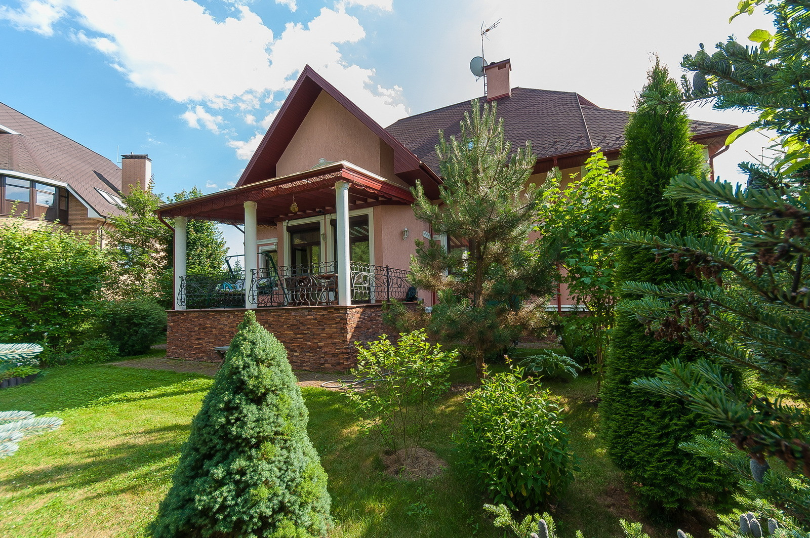 - На участке 5 плодоносных яблок, голубые ели, сосны, ягодные кусты, много цветов.