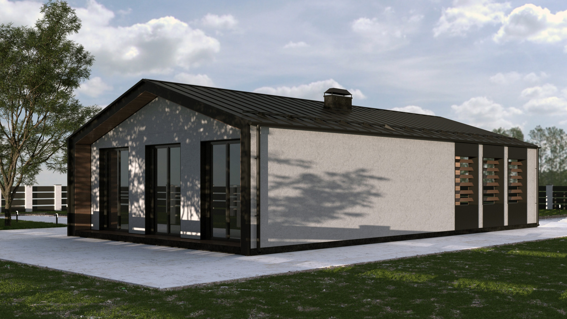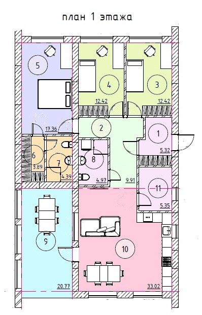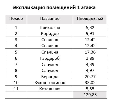 Кухня- гостиная – 33,02 м², 3 Спальни- 12,42 м², 12.42 м², 17.36 м², 2 санузла- 4,39 м²,4,96 м², веранда 33,02 м²