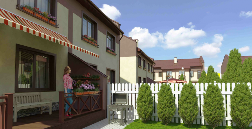 Каждый коттедж-дуплекс состоит из двух домов с отдельными входами и придомовой территорией.У всех домов благоустройство придомовой территории выполнено в одной концепции, с отсутствием высоких заборов, что делает улочки посёлка такими живописными и уютными.