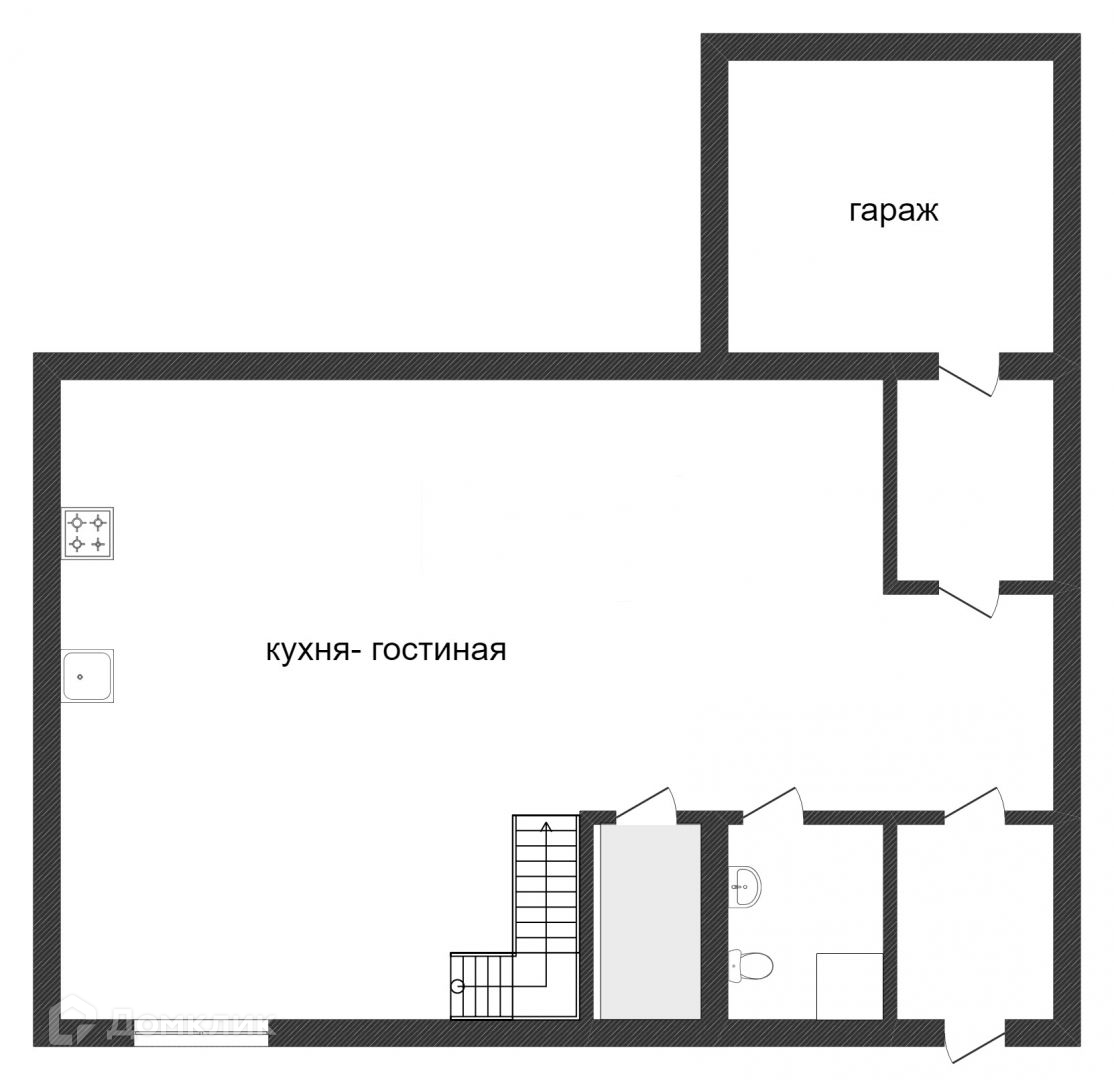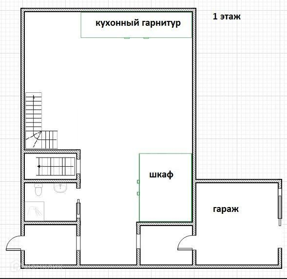 1 этаж: большая гостиная совмещённая с кухней, санузел (душевая кабина, туалет, пол с подгревом)