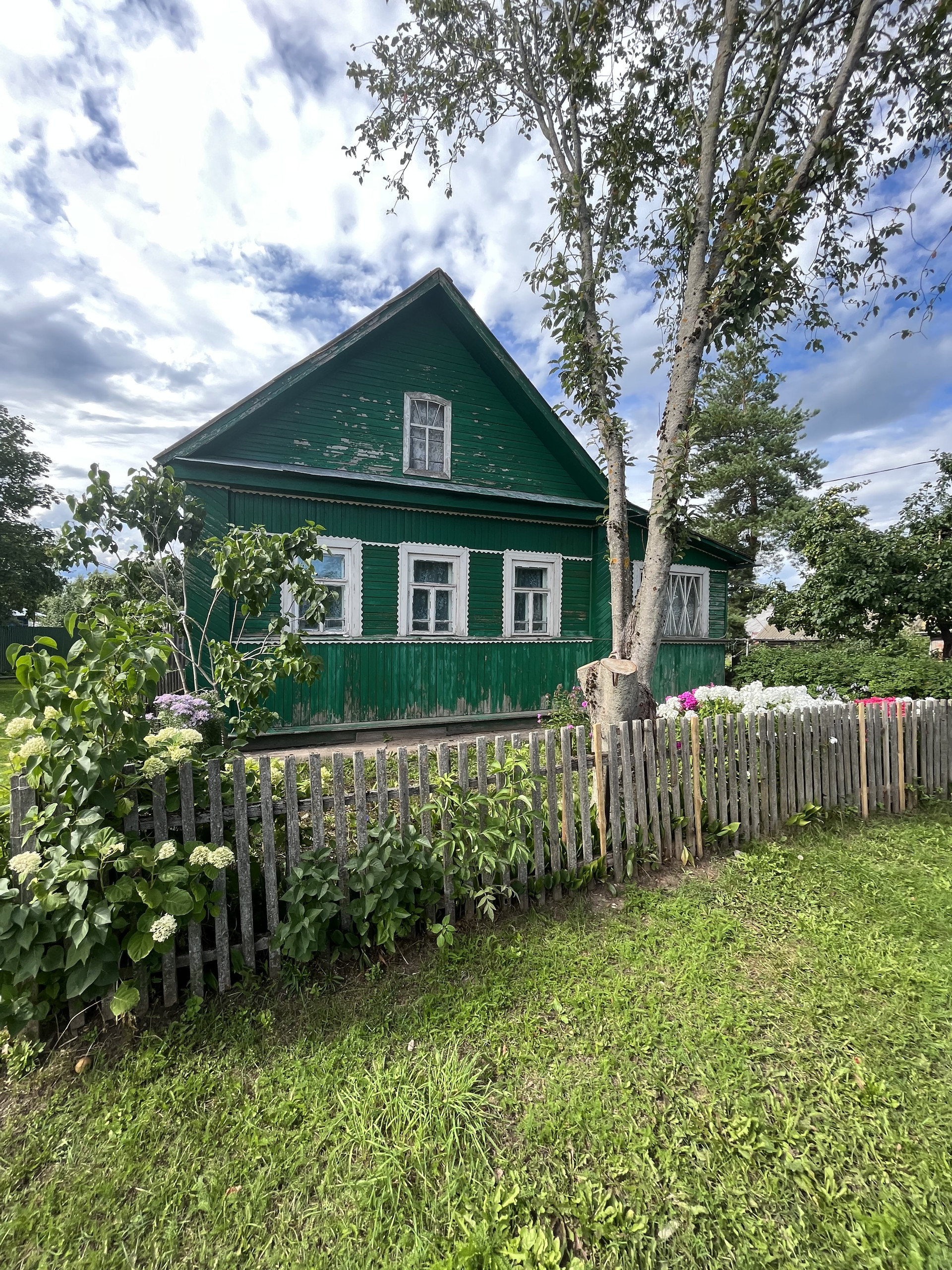 ✅перед домом зазаборенный палисадник с клумбами цветов и цветущих кустарников.
