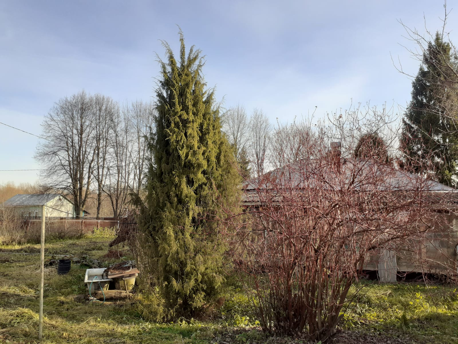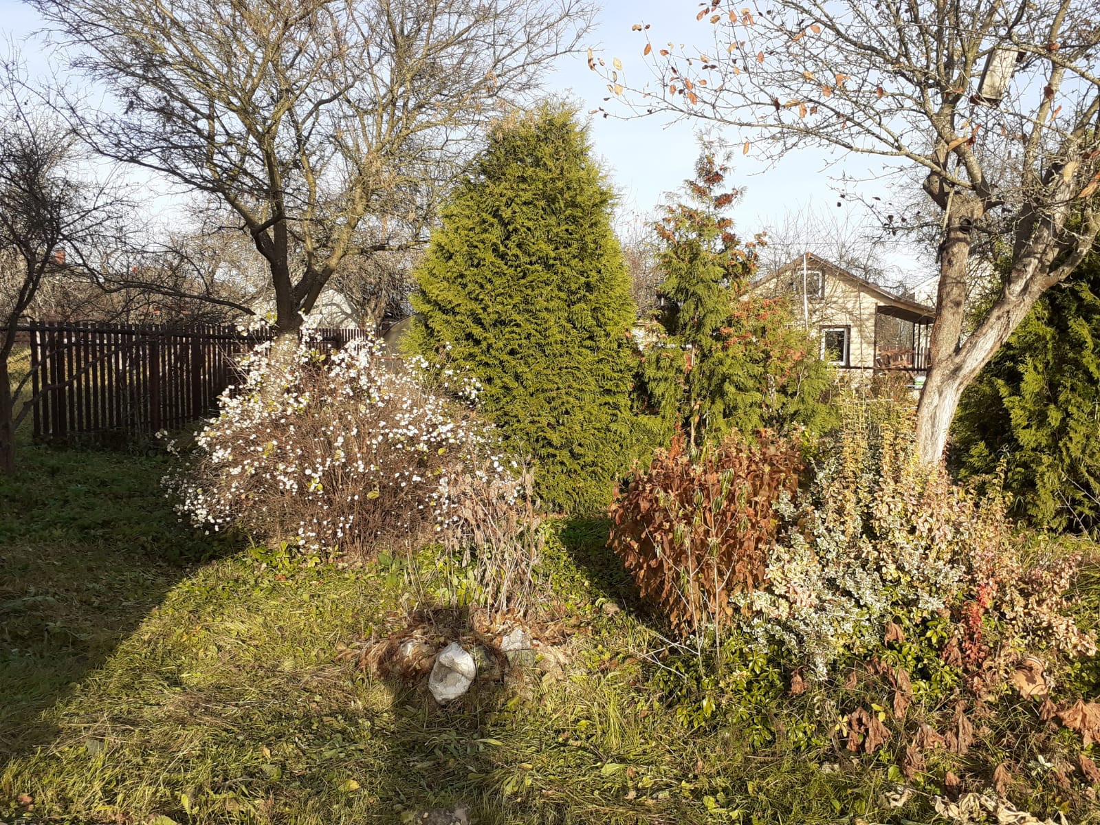 Во дворе посажены плодовые деревья, кустарники, множество красивых многолетних цветов, несколько огромных и красивых можжевельников.