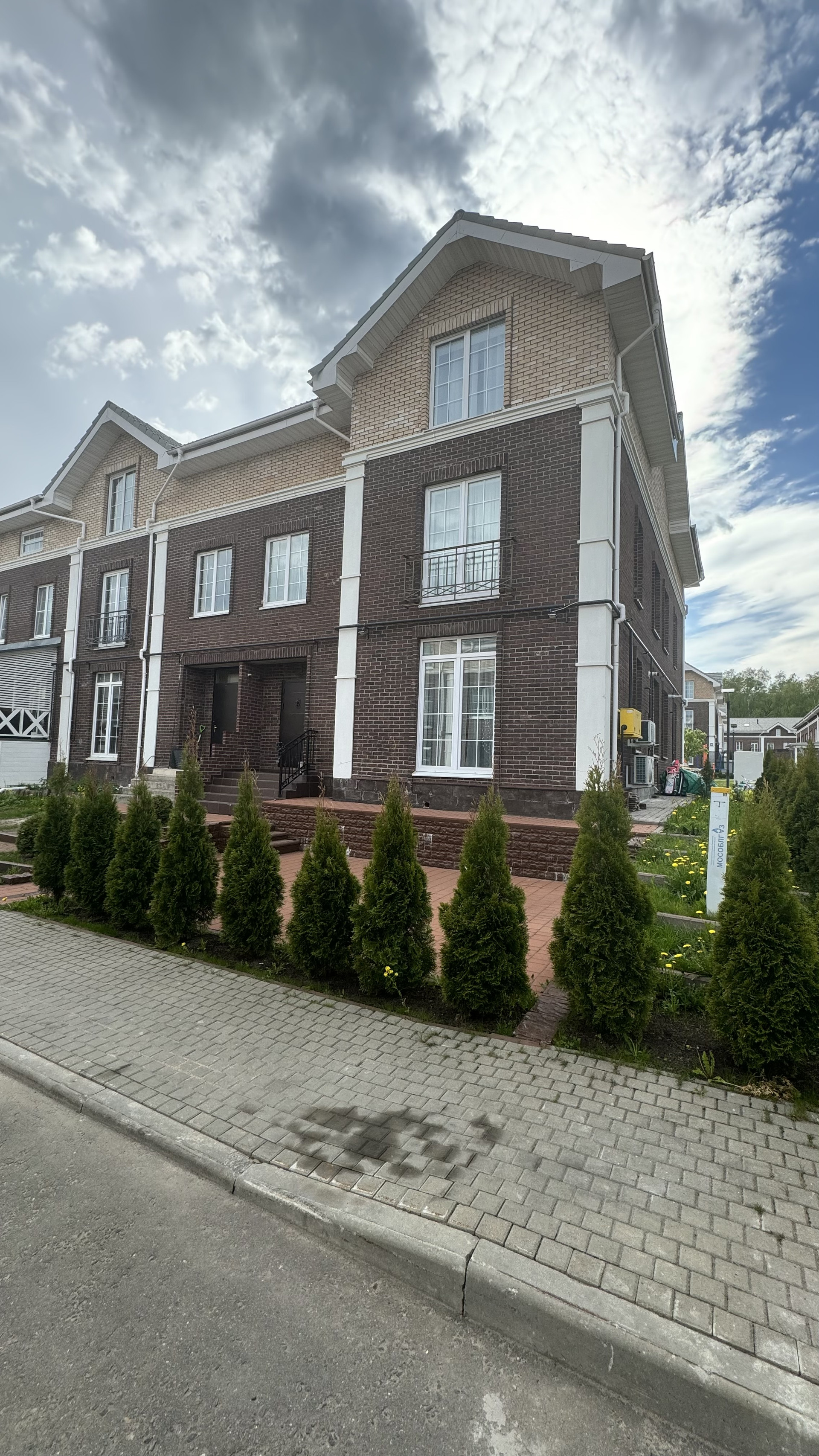 Перед домом благоустроена территория, парковочное место выложено плиткой, придомовая территория засажена красивыми растениями, очень комфортное пространство.