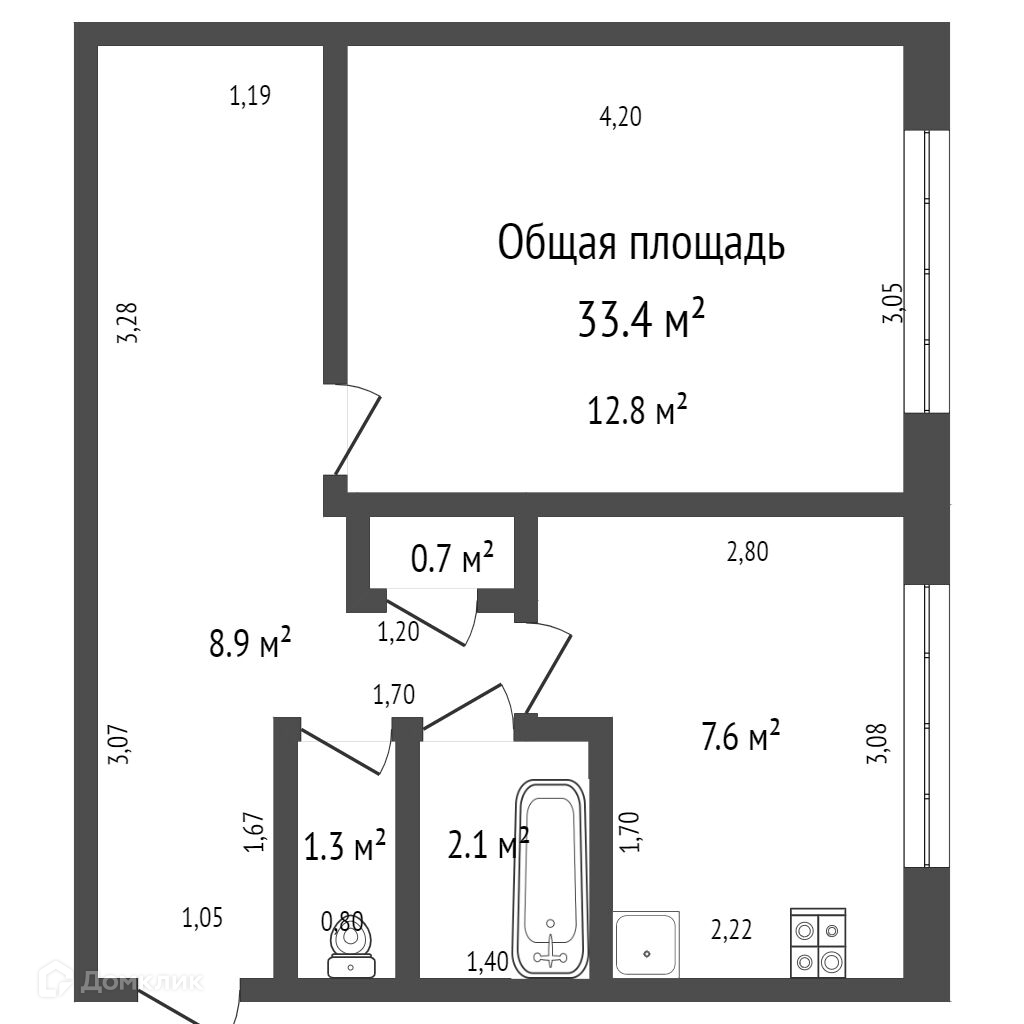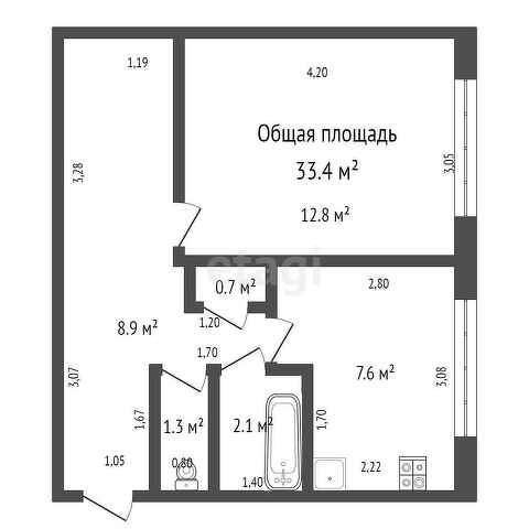 Общая площадь 33.4 м2