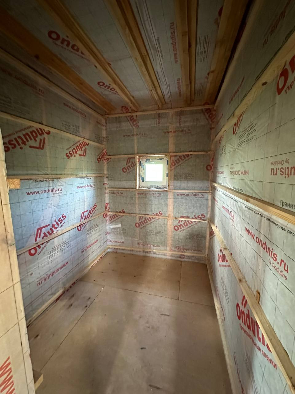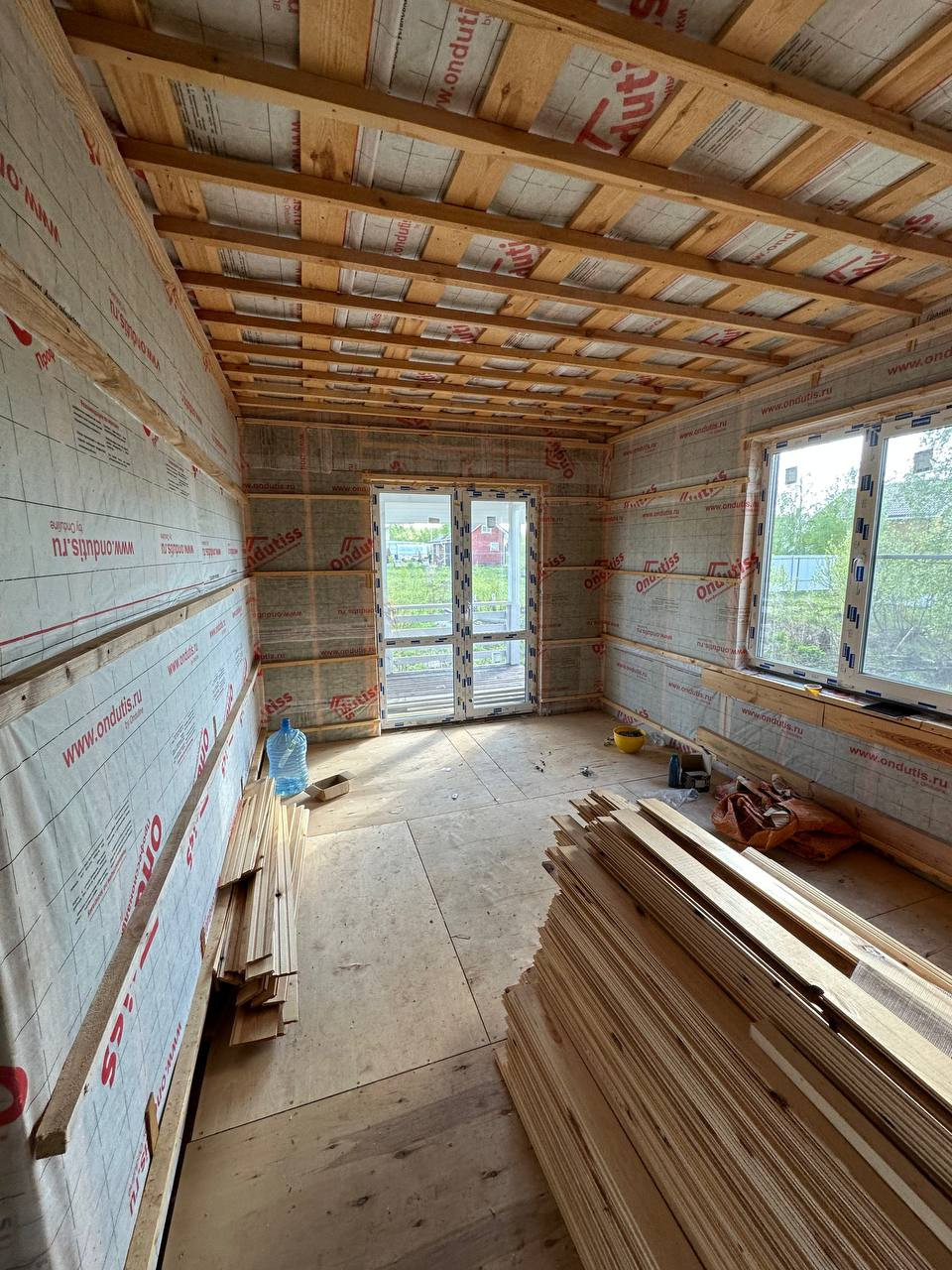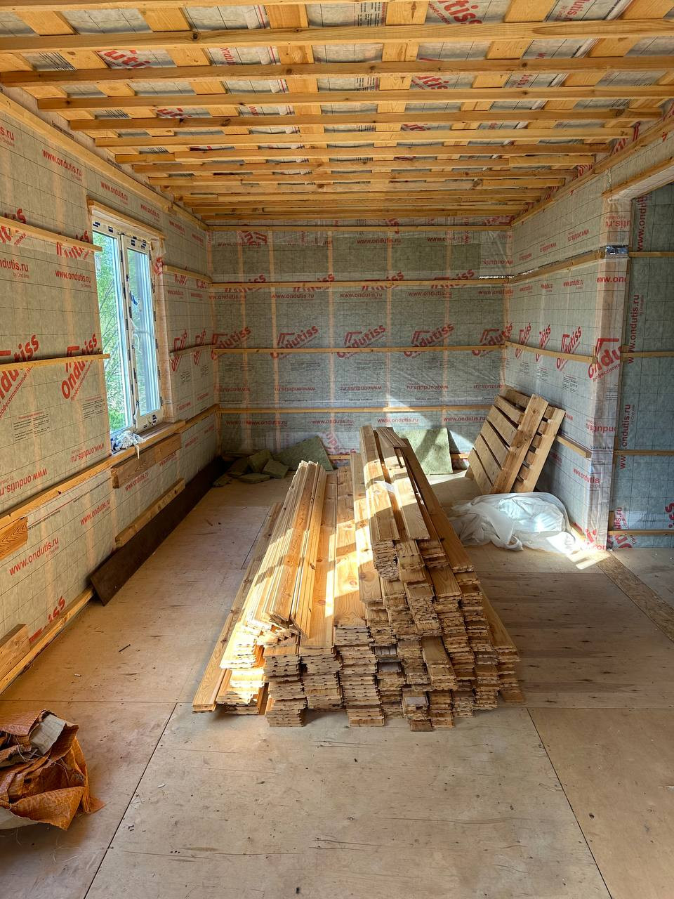 * обшит плитами Белтермо шип-паз 25мм (что повышает тепло- и шумоизоляцию и повышает прочность)