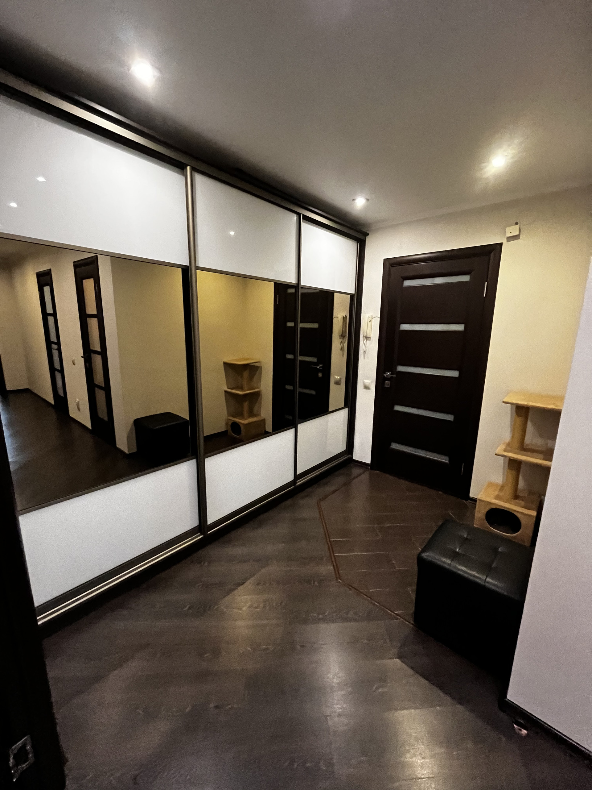 Большой и вместительный встроенный шкаф купе в прихожей (включает в себя так же отделы для хранения гладильной доски, пылесоса)