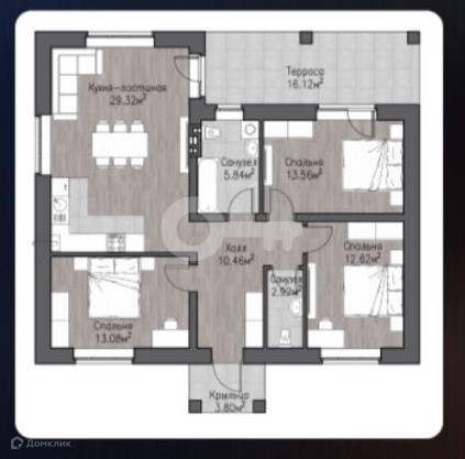 - Функциональная планировка: просторная кухня-гостиная с выходом на террасу, 3 спальни, 2 санузла, холл, котельная, терраса.