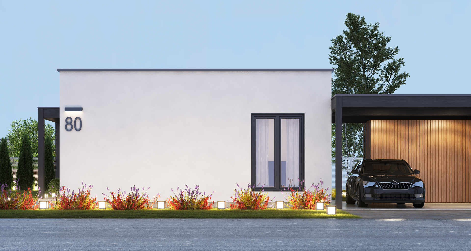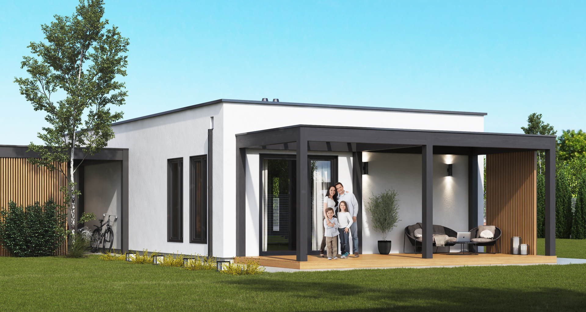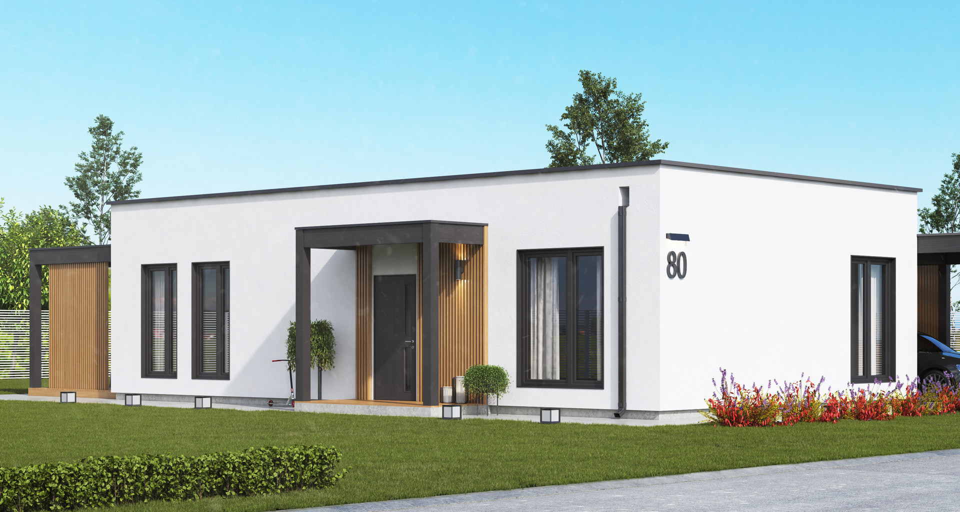 Дом: одноэтажный дом с плоской кровлей в скандинавском стиле с собственной террасой. Высота потолков - 3 м.