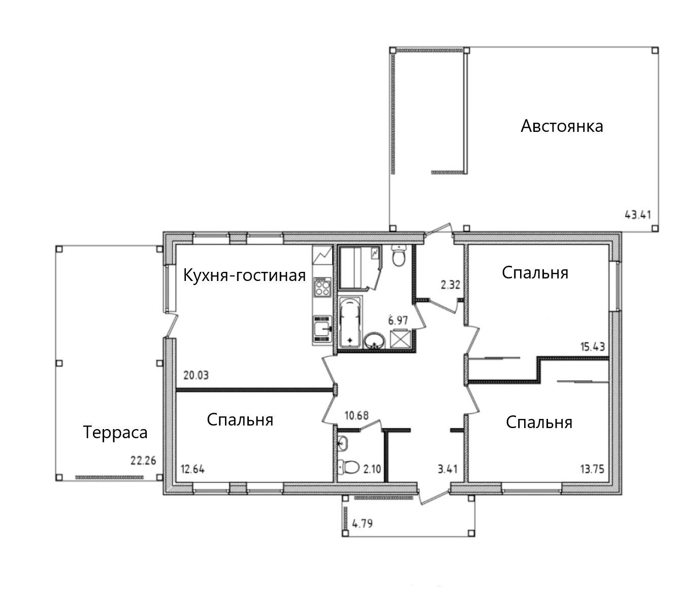 Материал стен: трехслойная панель, состоящая из двух слоев бетона и утеплителя (200 мм) внутри. Все конструкции дома произведены в заводских условиях с контролем качества.