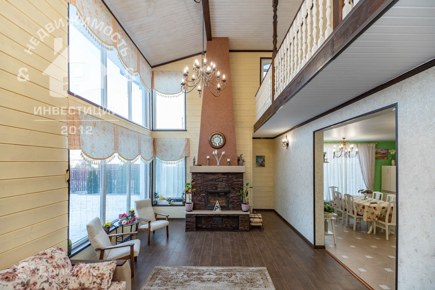 светлая гостиная с дровяным камином, витражными окнами и застеклённой террасой;