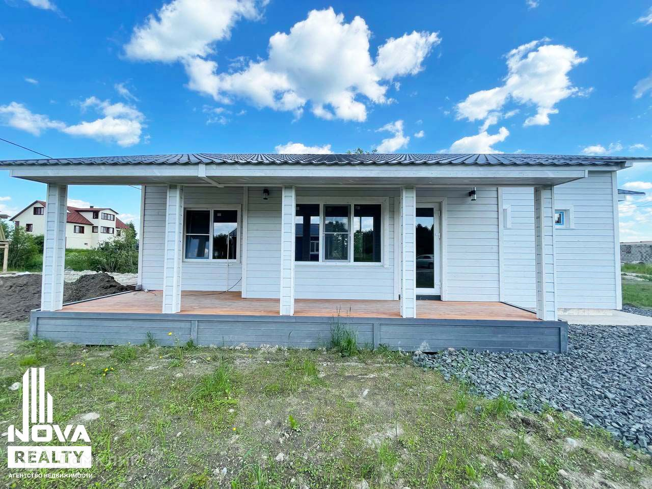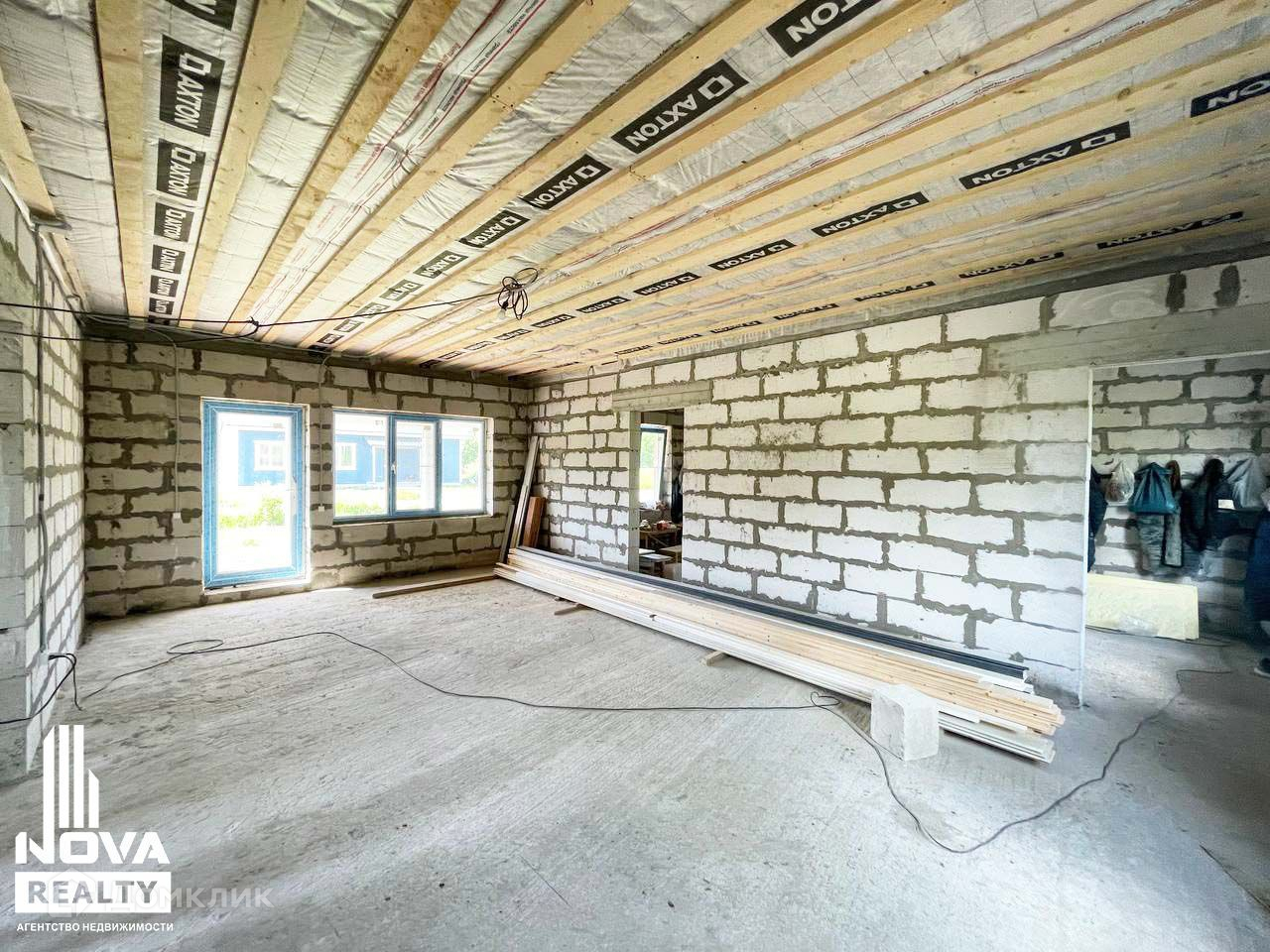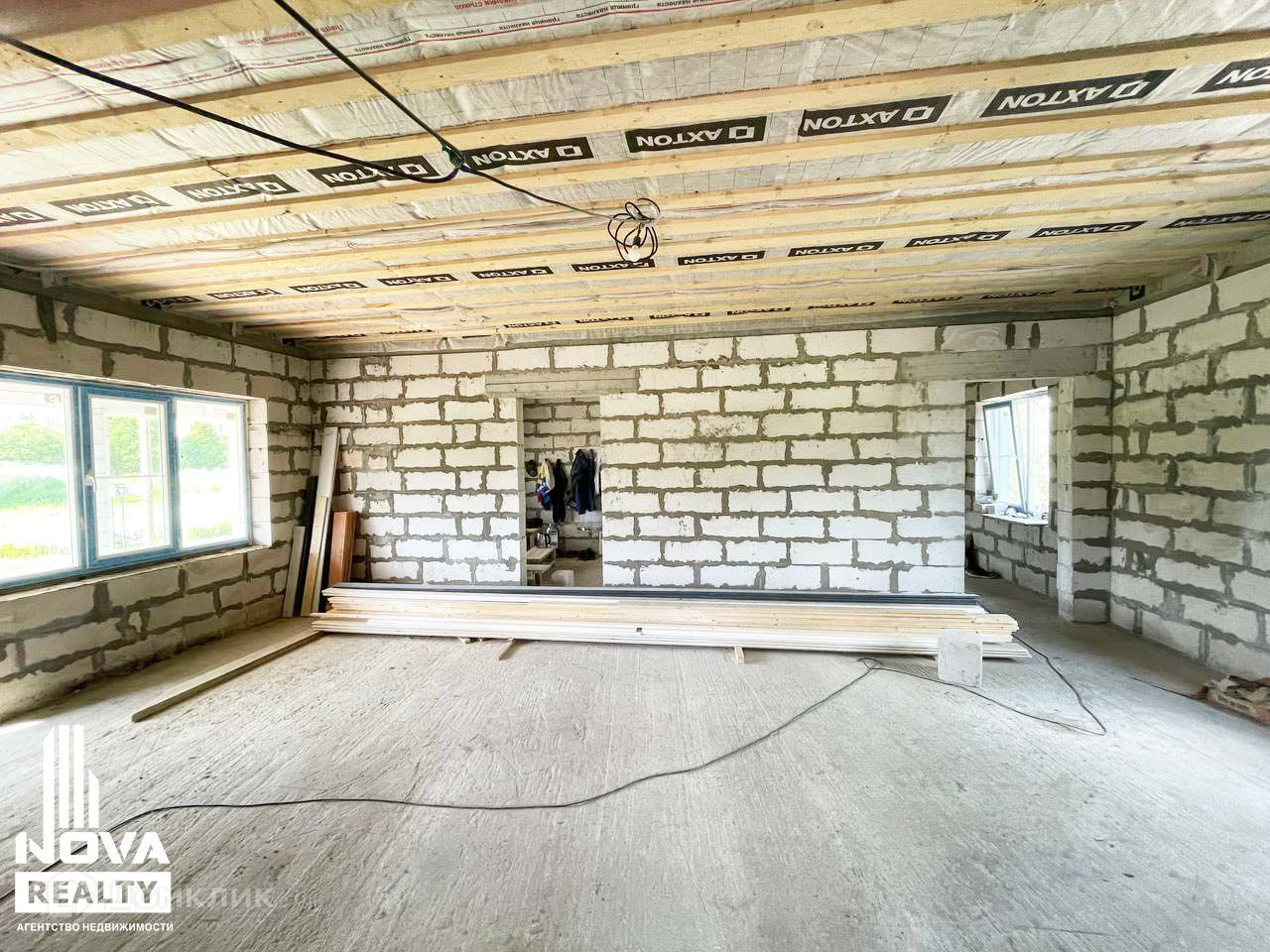 Установлены пластиковые стеклопакеты, в гостиной предусмотрена панорамная стеклянная дверь с выходом на крытую террасу. Выполнены бетонные отмостки фундамента.