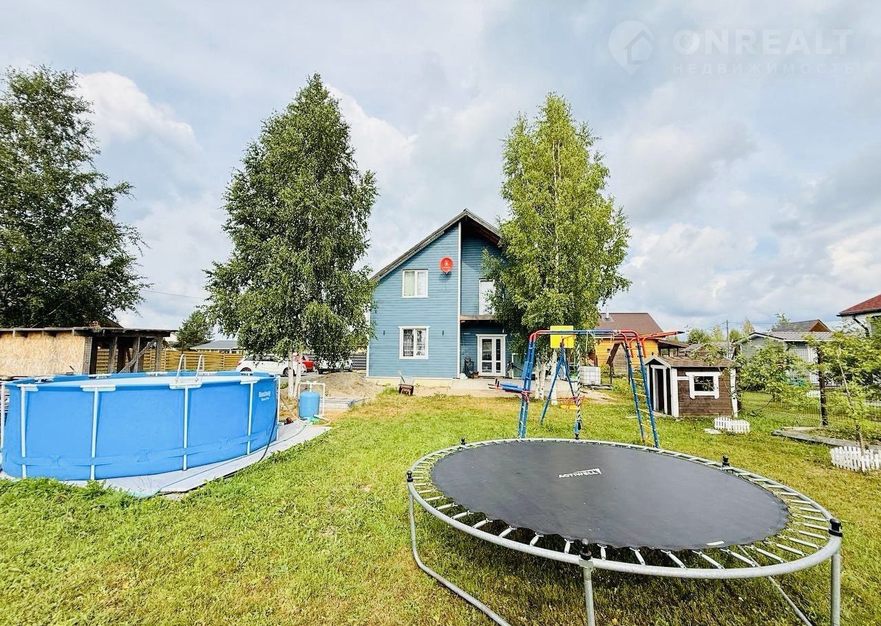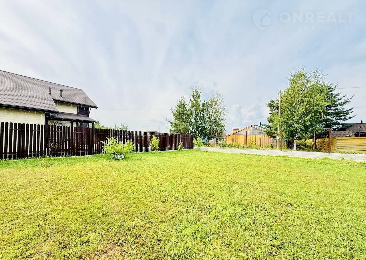 На участке есть детский уголок с домиком, забор по периметру, ухоженный газон.