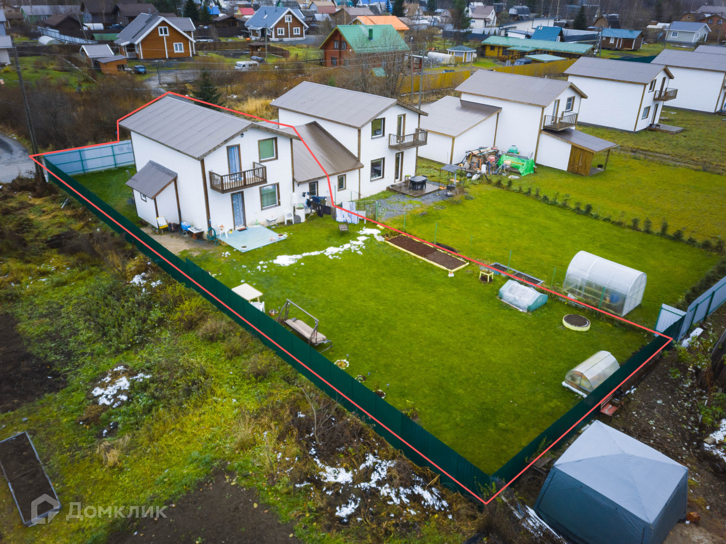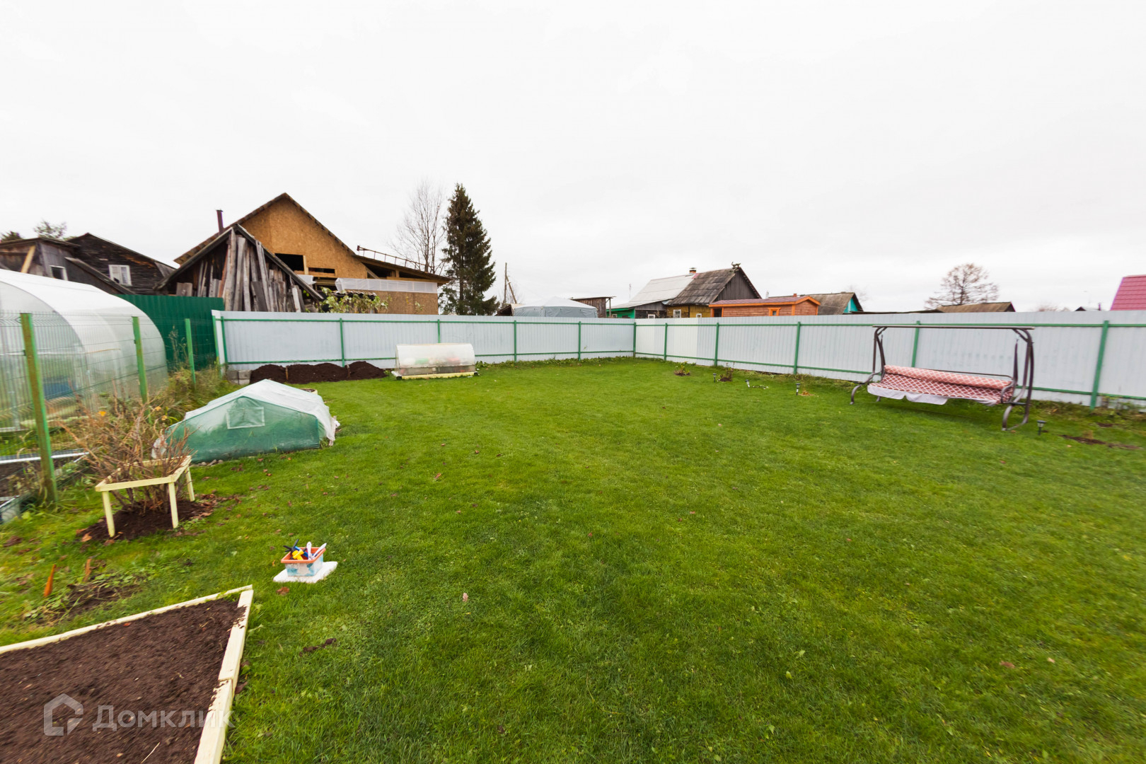 Участок сухой, правильной прямоугольной формы, вдоль всего участка сделан грамотный дренаж, посажен газон, кустарники. Теплица и парник.