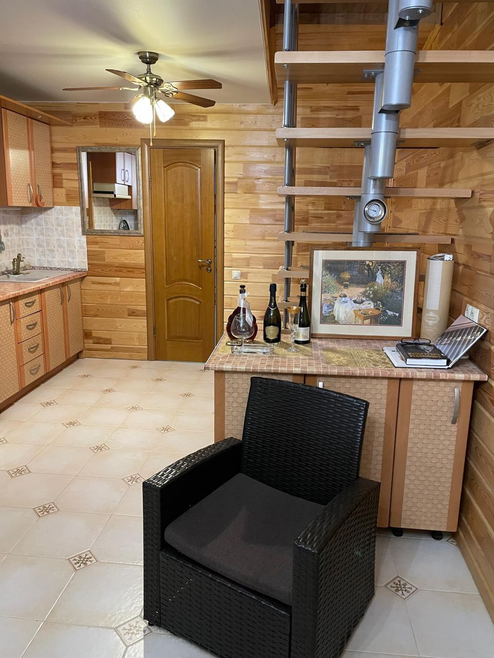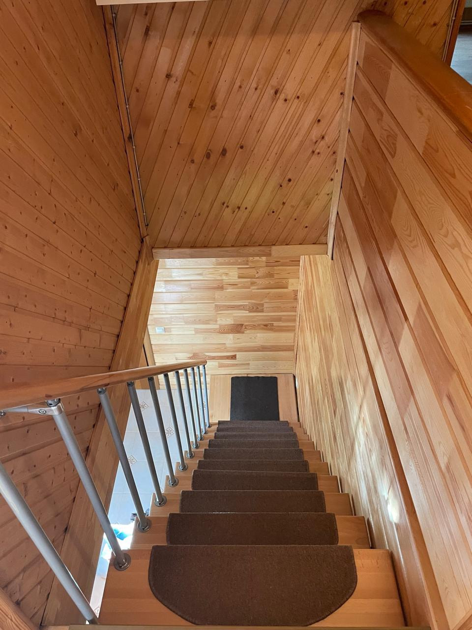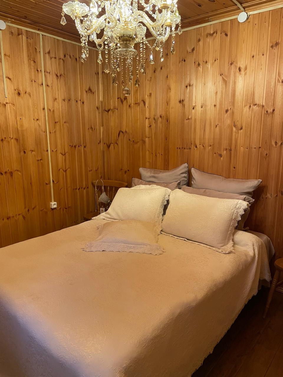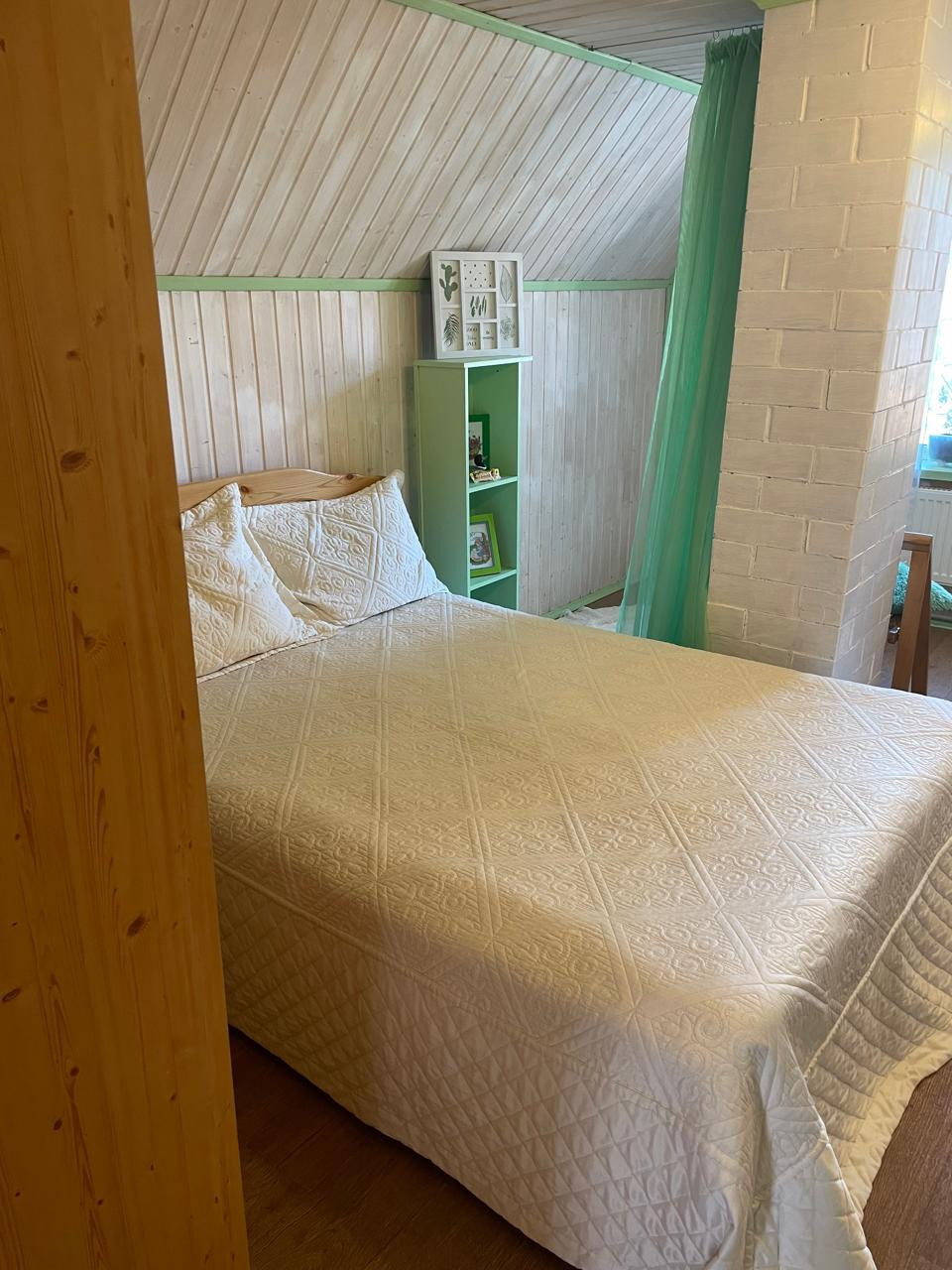 Дом: 1-й этаж - вместительный коридор, кухня-гостинная с баром, комната для отдыха с камином и библиотекой, где вы сможете разместиться большой дружной семьей, встретить гостей; две спальные комнаты и санузел с душем выложен плиткой.