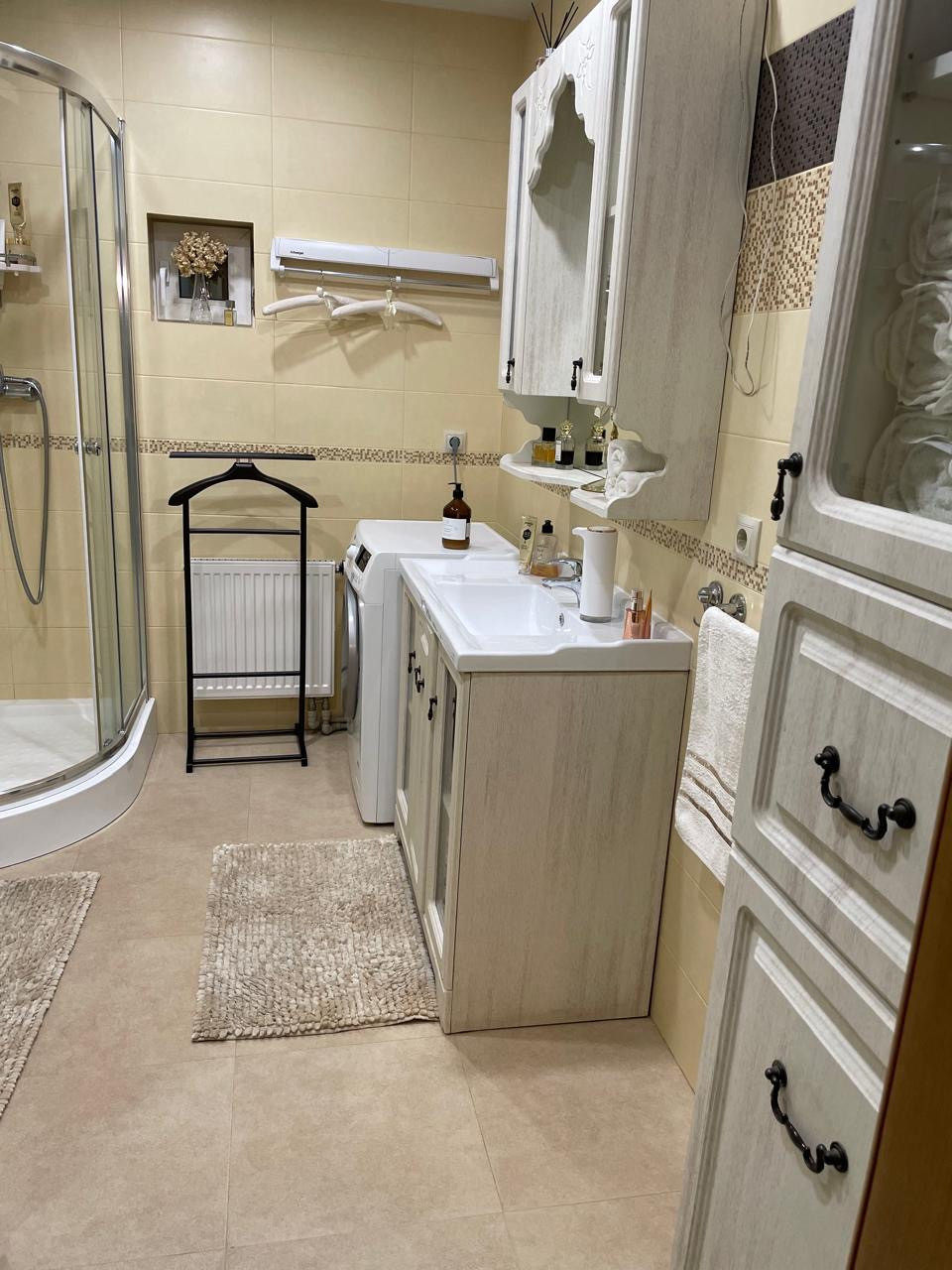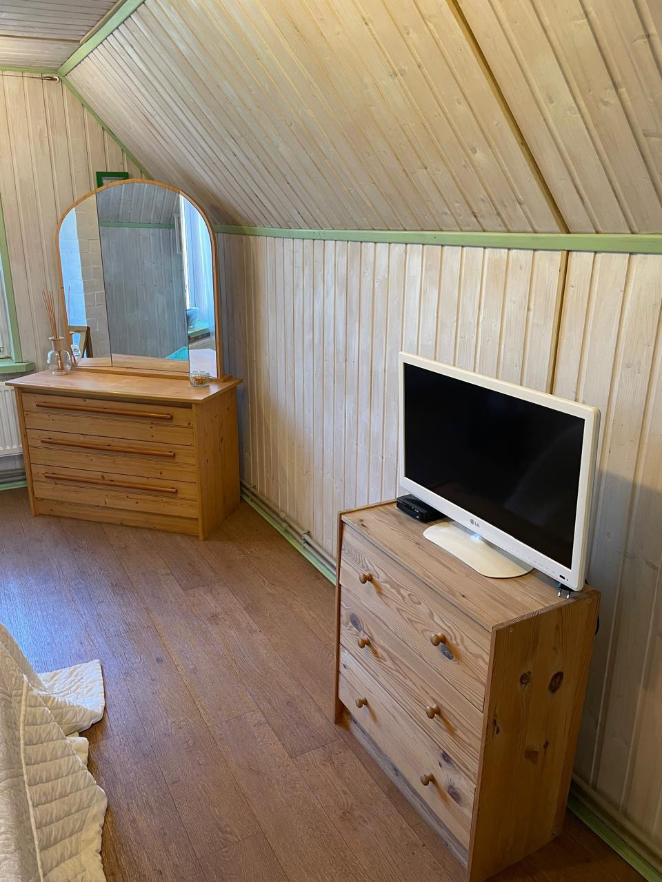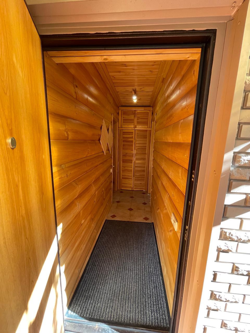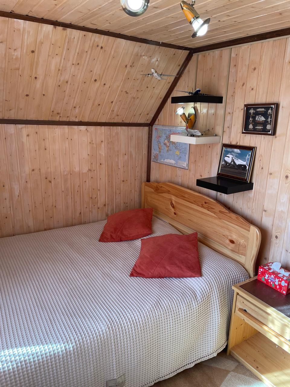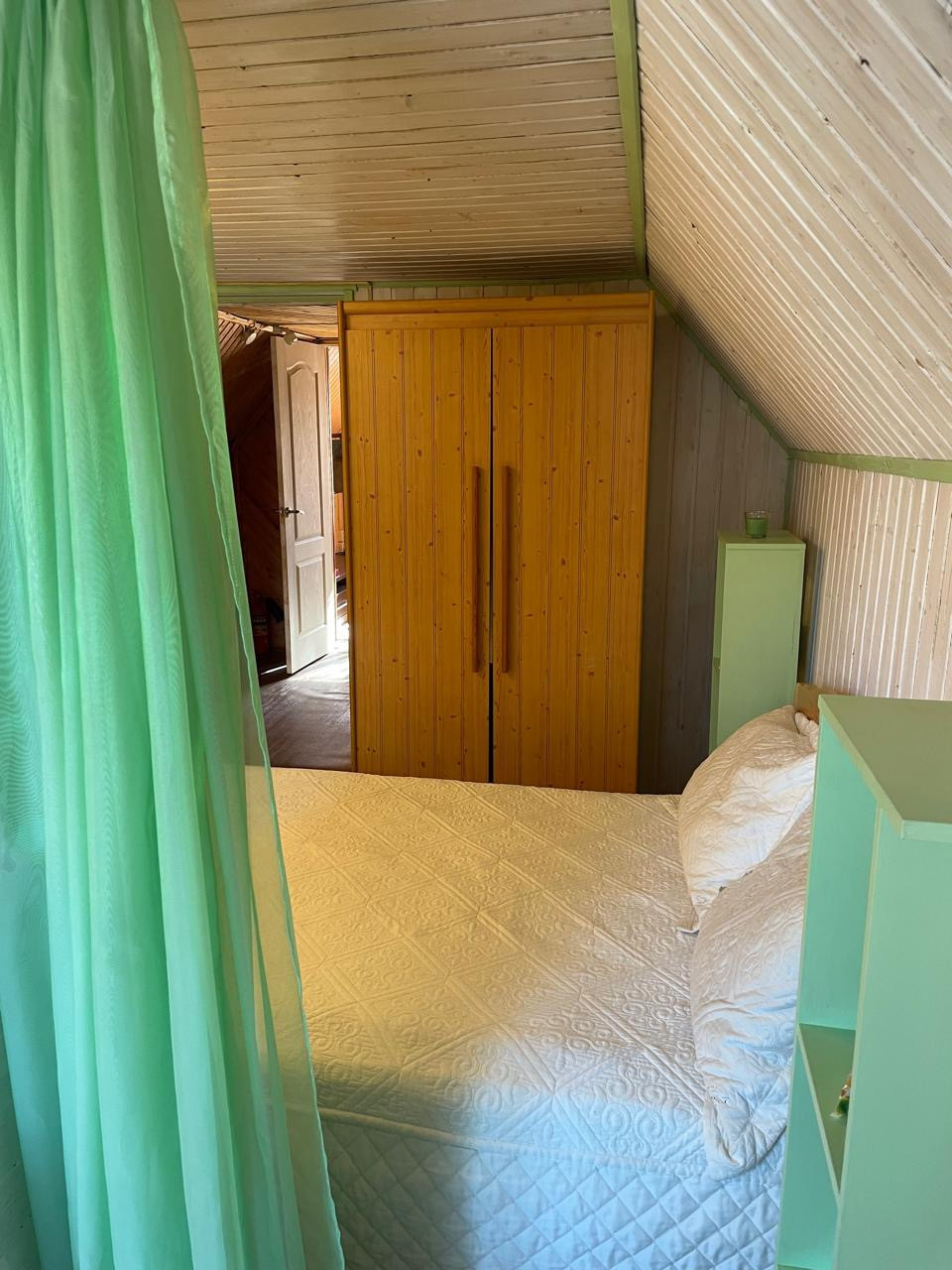 Дом: 1-й этаж - вместительный коридор, кухня-гостинная с баром, комната для отдыха с камином и библиотекой, где вы сможете разместиться большой дружной семьей, встретить гостей; две спальные комнаты и санузел с душем выложен плиткой.