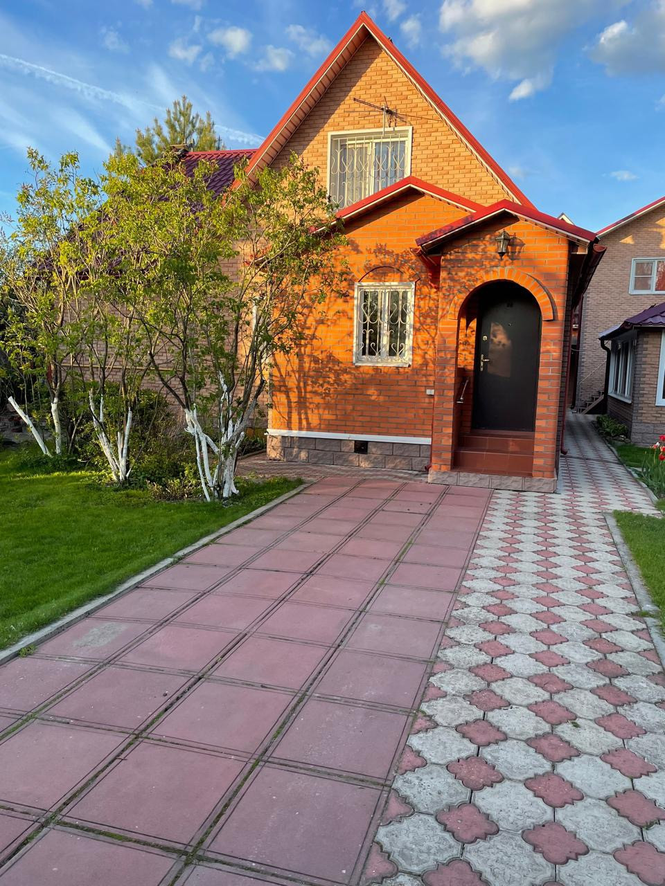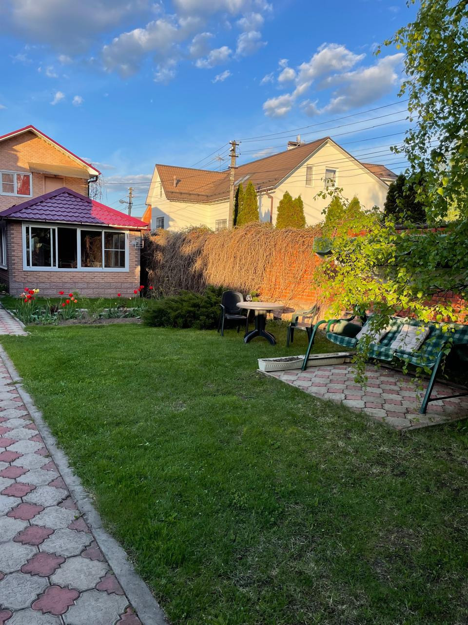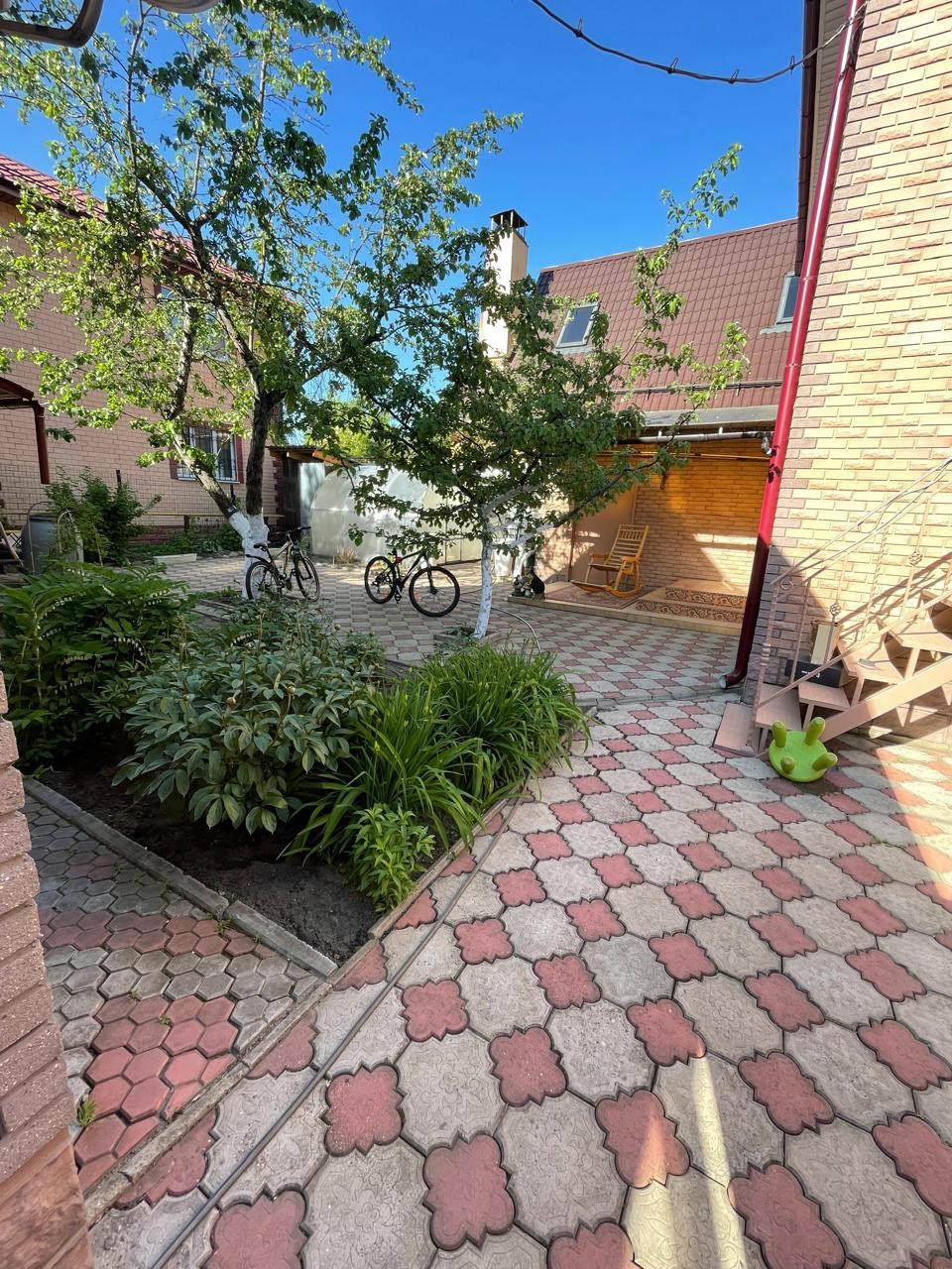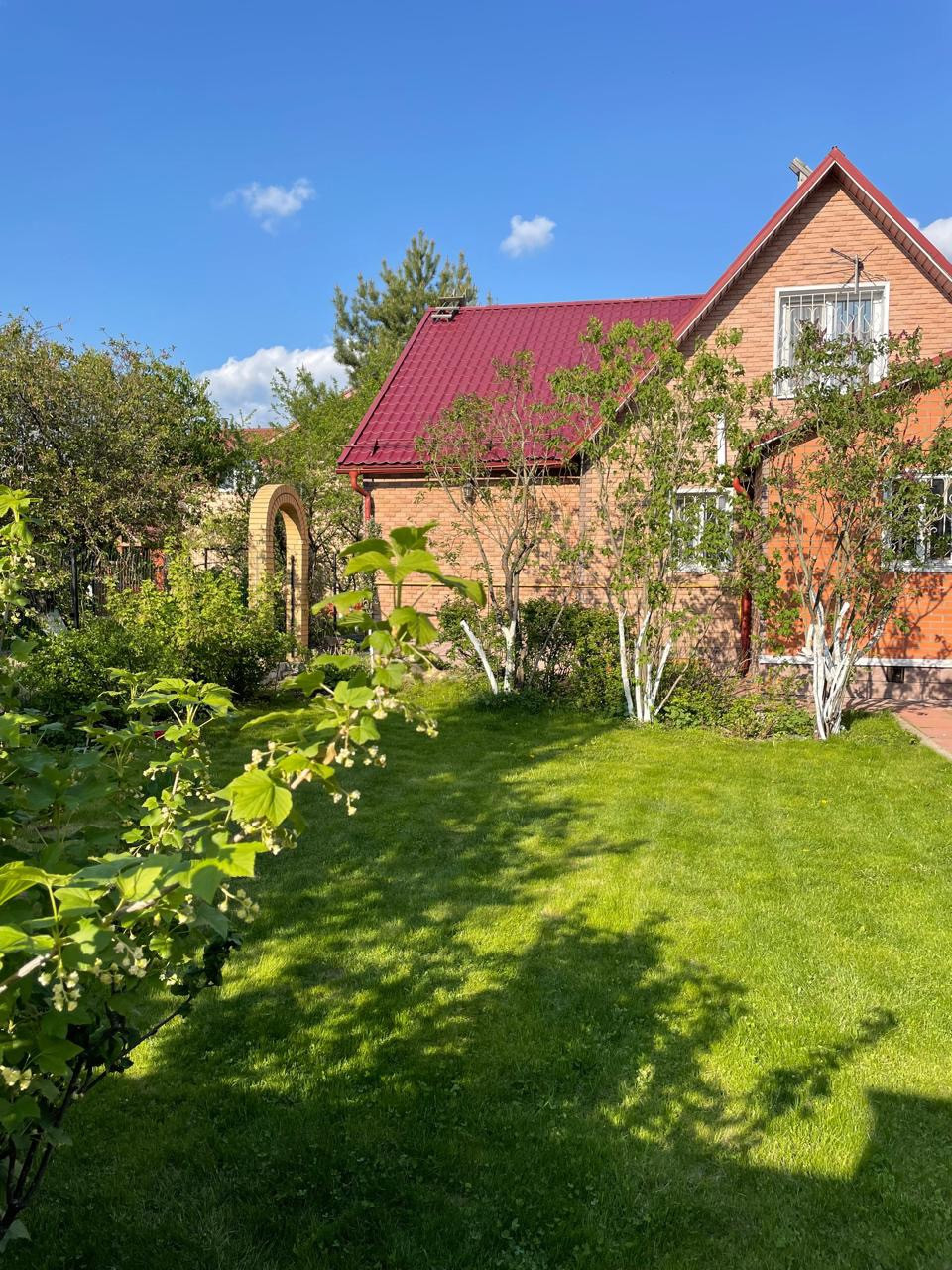 Ухоженная и зеленая территория с множеством красивых и ярких цветов, плодовых деревьев и вкусных ягод, береза, ель. Территория выложена тротуарной плиткой и огорожена кирпичным забором. Обустроенная летняя детская площадка и качели с навесом для уютных вечеров или утреннего чаепития под пение птиц.