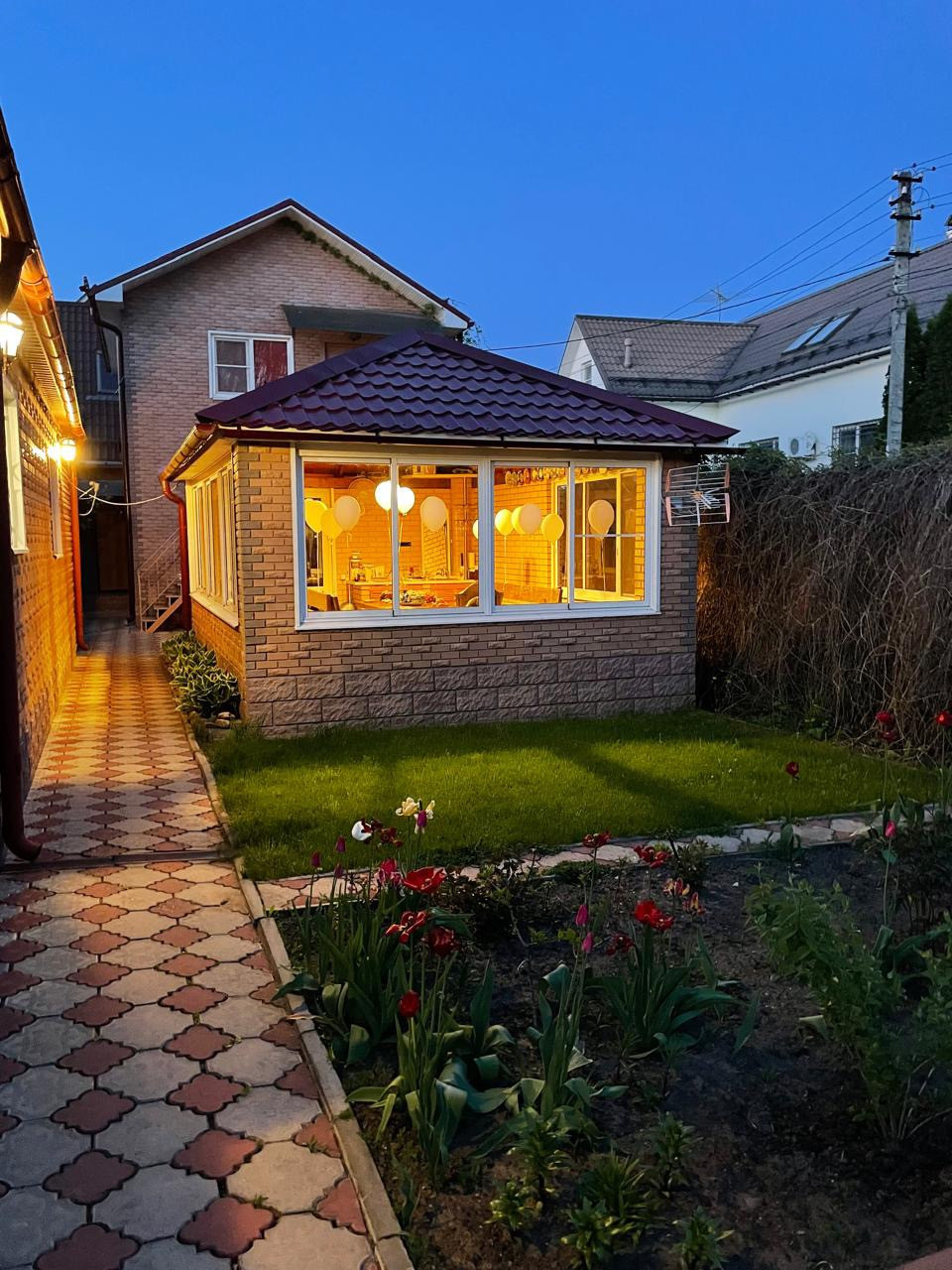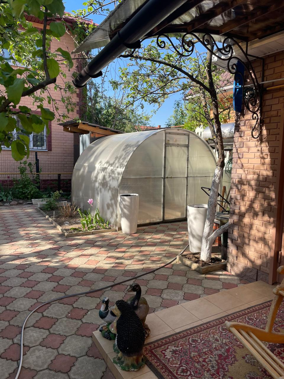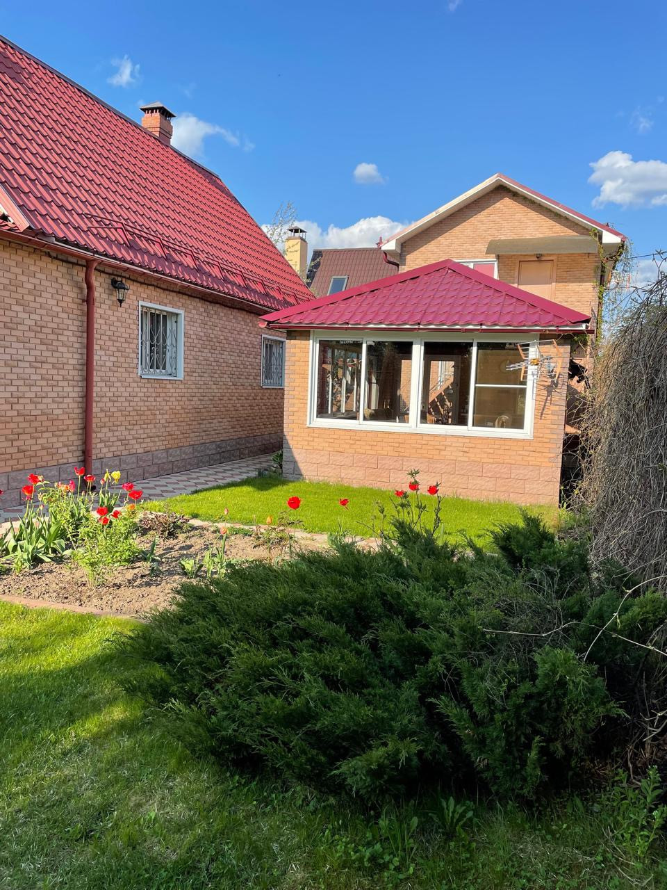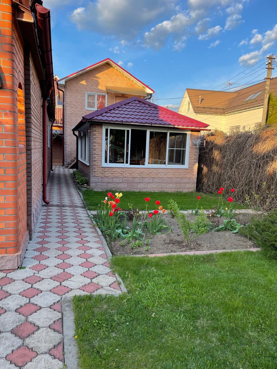 Ухоженная и зеленая территория с множеством красивых и ярких цветов, плодовых деревьев и вкусных ягод, береза, ель. Территория выложена тротуарной плиткой и огорожена кирпичным забором. Обустроенная летняя детская площадка и качели с навесом для уютных вечеров или утреннего чаепития под пение птиц.