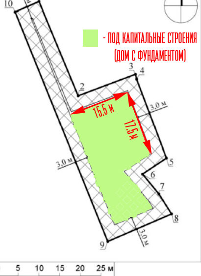 17.5 х 15.5 метров с учетом 3х метровых отступов от забора. Можно построить дом площадью 250 кв.м. по фундаменту.