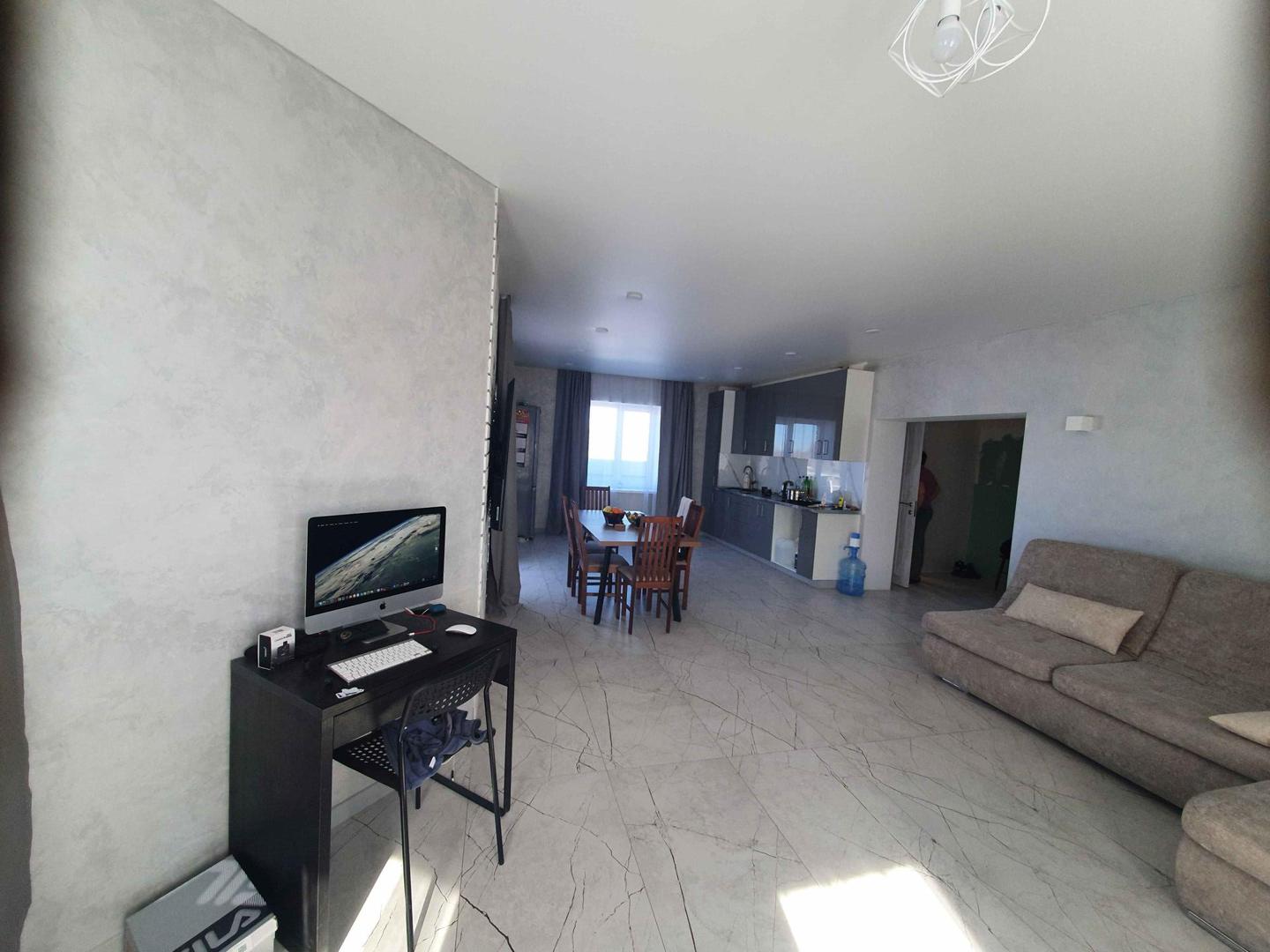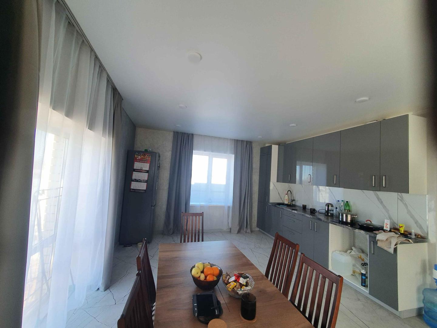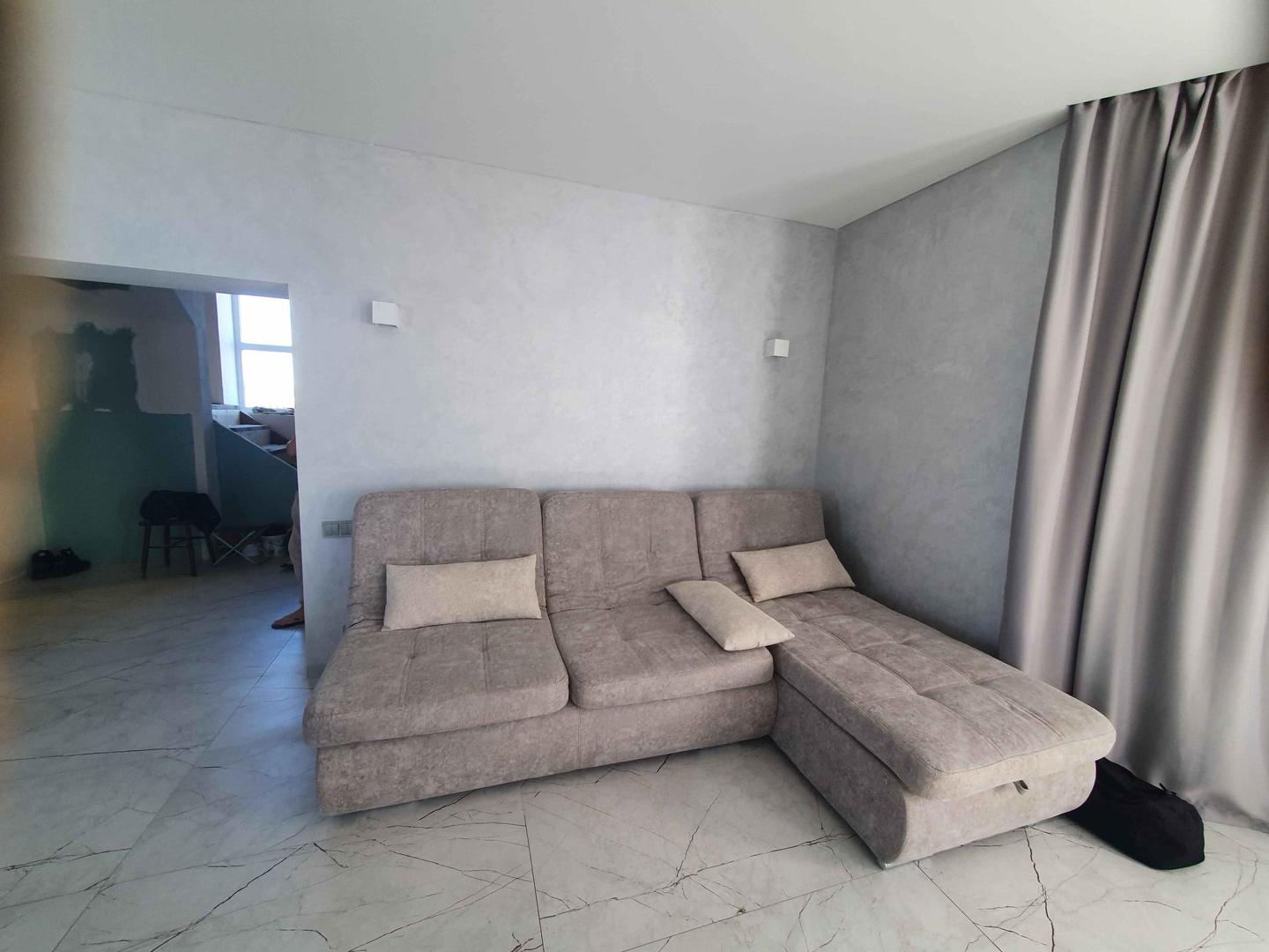 Все стены выравнены под маяк, нанесена современная декоративная штукатурка. Потолок выполнен натяжным.