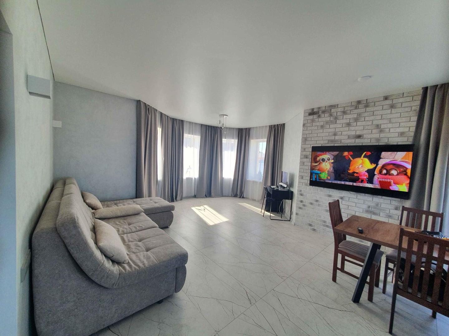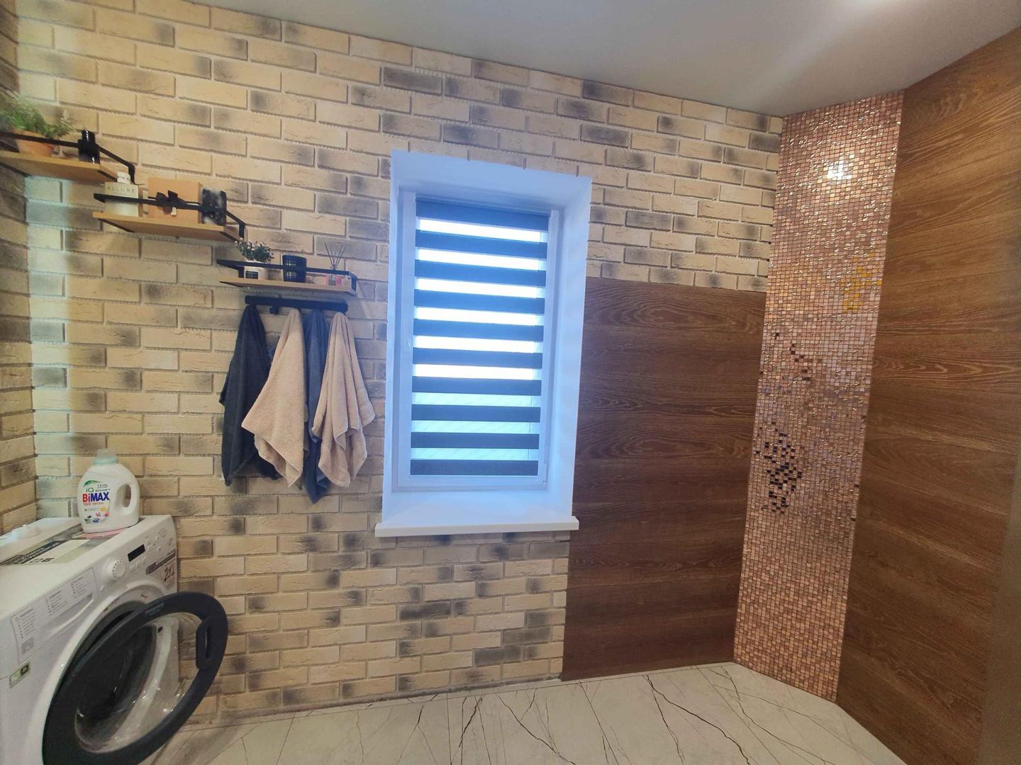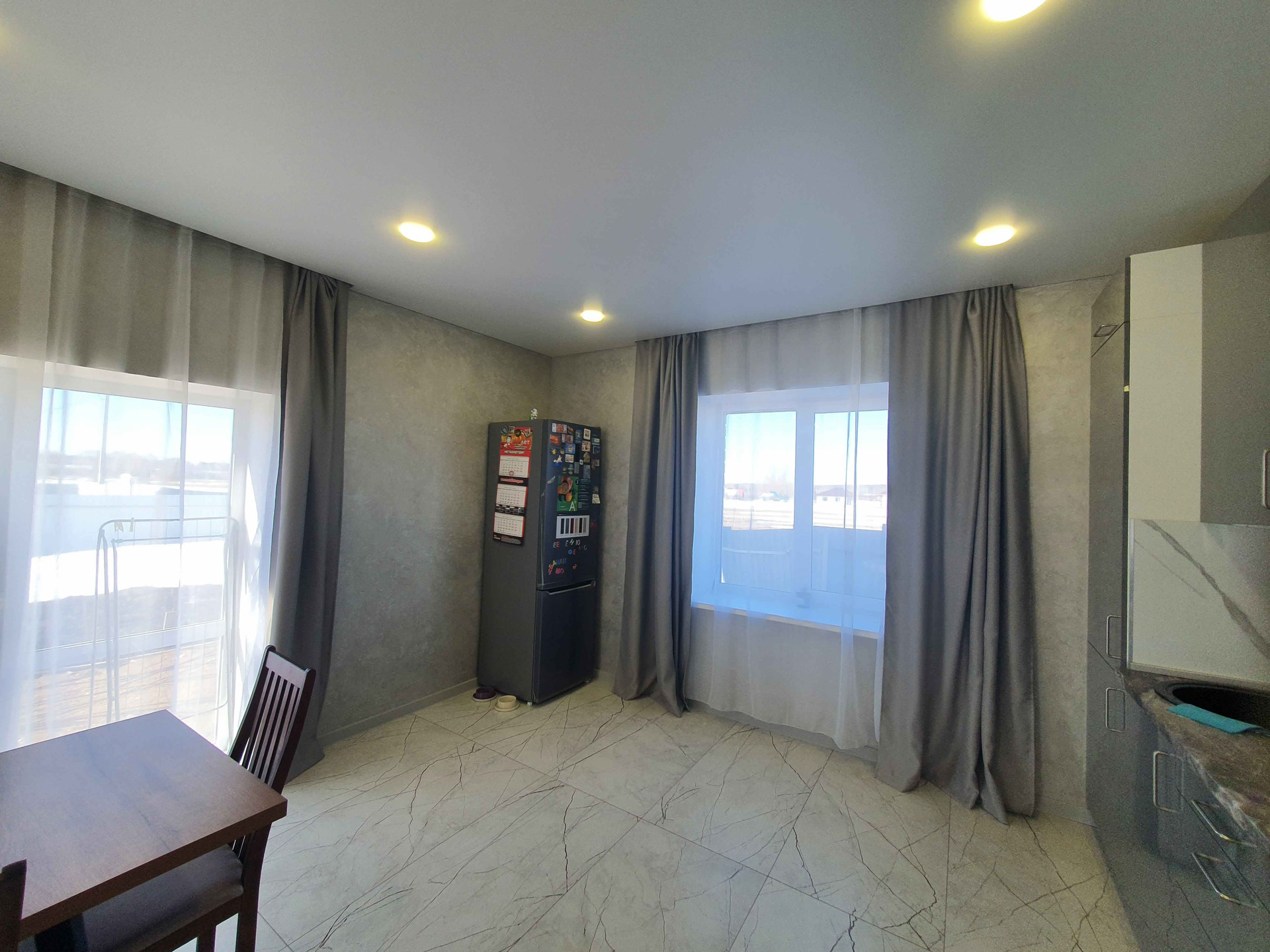 Все стены выравнены под маяк, нанесена современная декоративная штукатурка. Потолок выполнен натяжным.