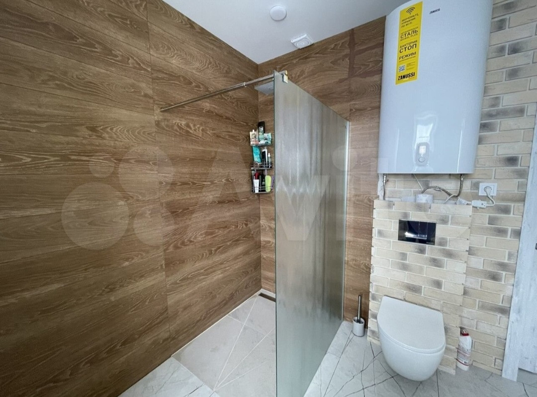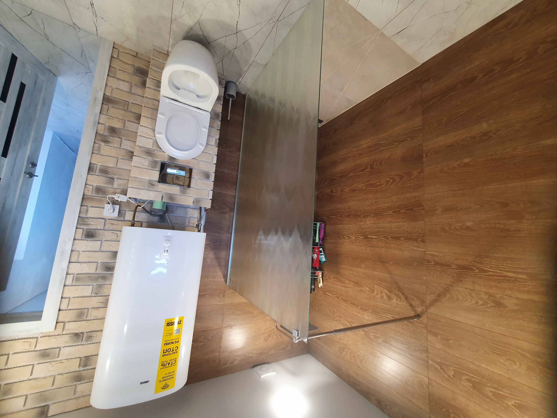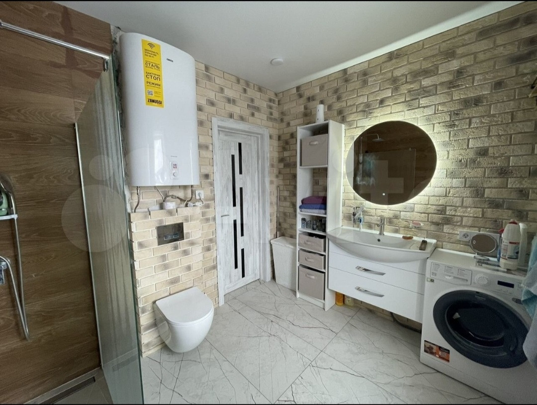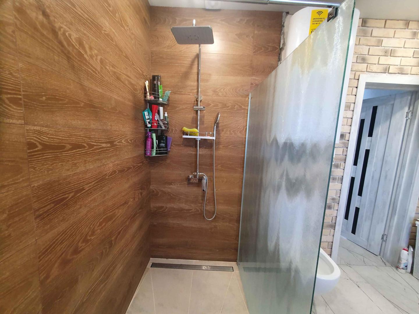 В совмещённом санузле установлен электрический котел, за счет которого идет подача горячей воды.