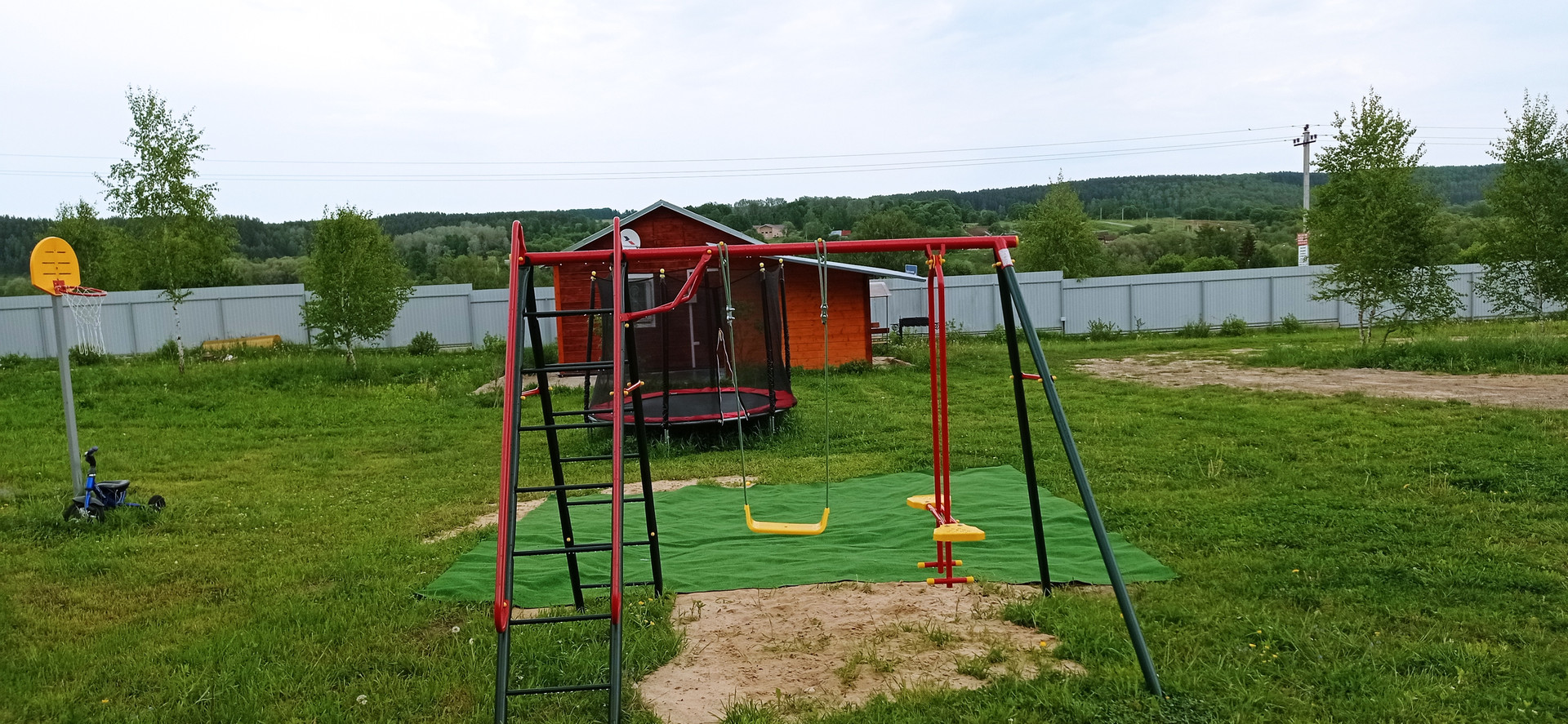 Есть парковка и детская площадка с батутом. В доме есть все от интернета до холодильника, кухня