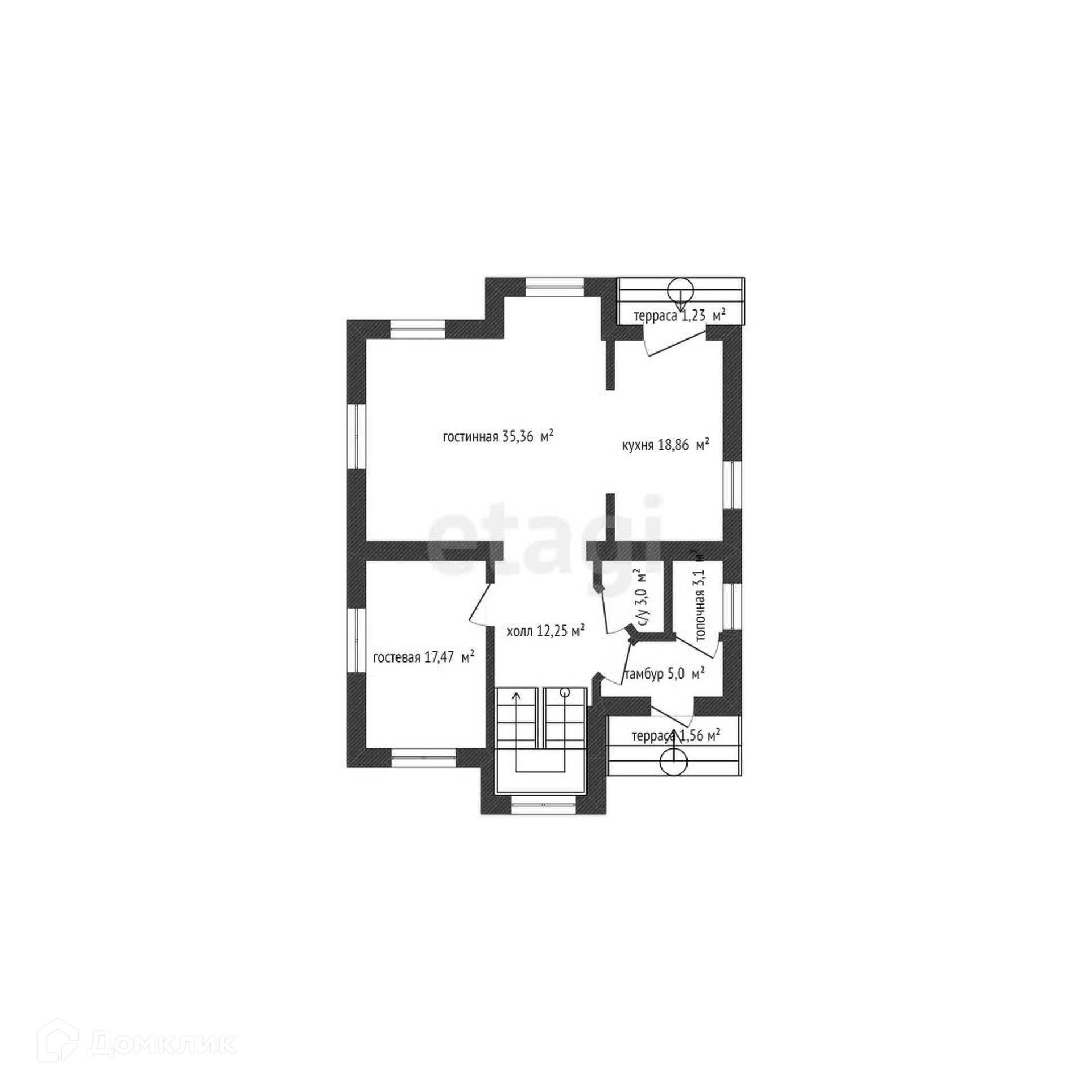 1 этаж: кухня с выходом во внутренний двор, большая гостиная-столовая, спальня, санузел и бойлерная;