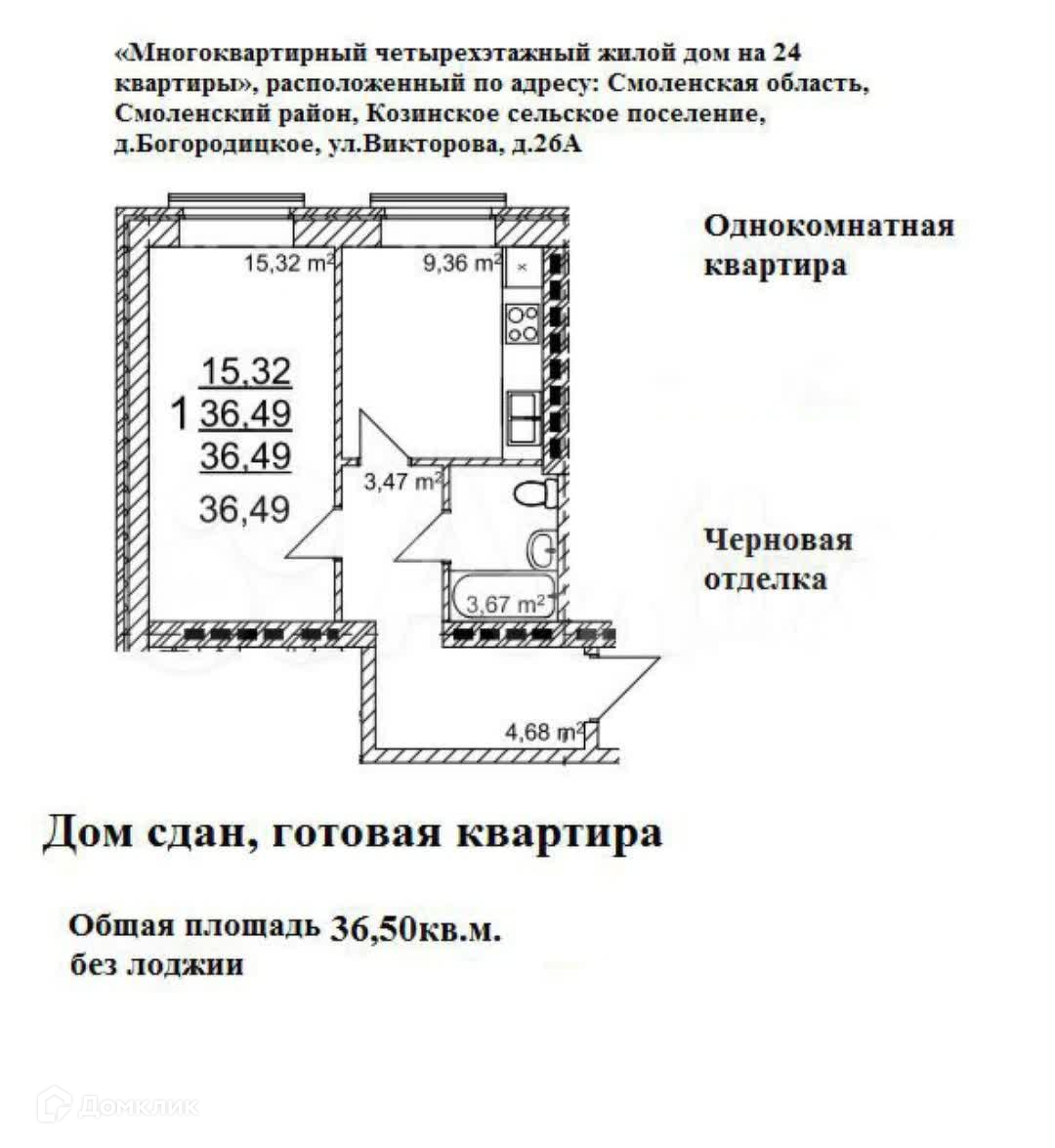 1-комнатная квартира, 35.5 м2, этаж 3 / 4, на продажу в деревне Богородицкое, улица Викторова, 26А
