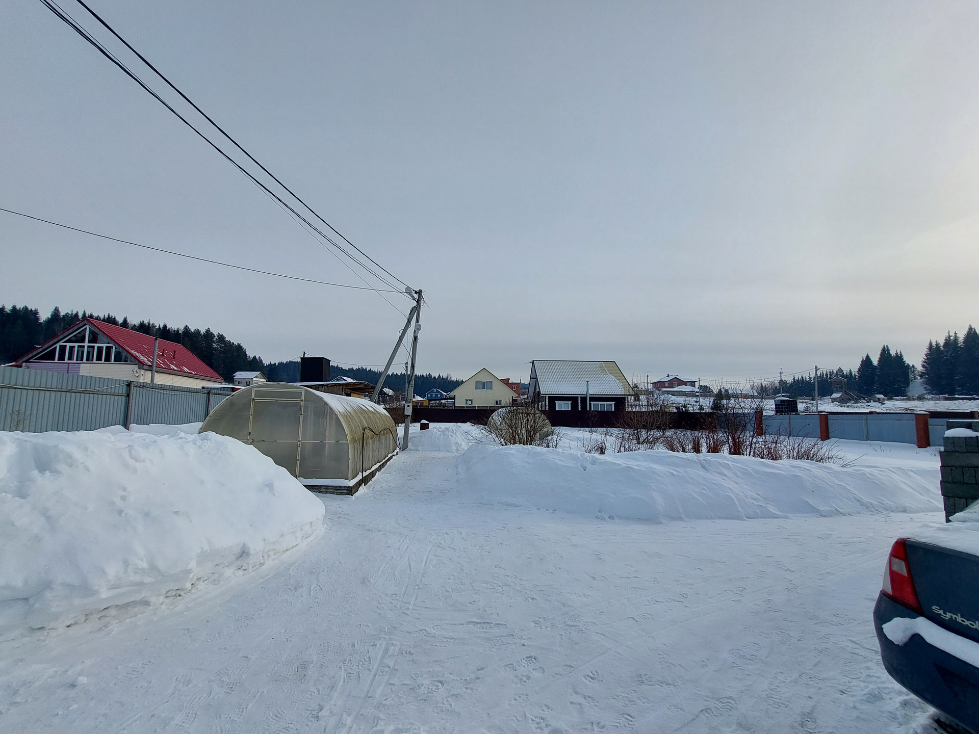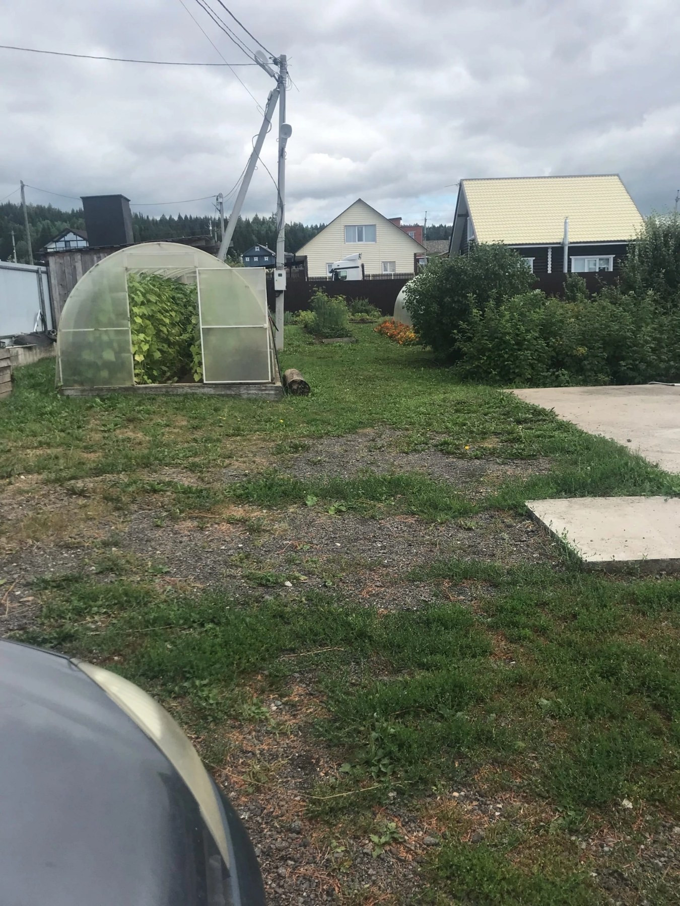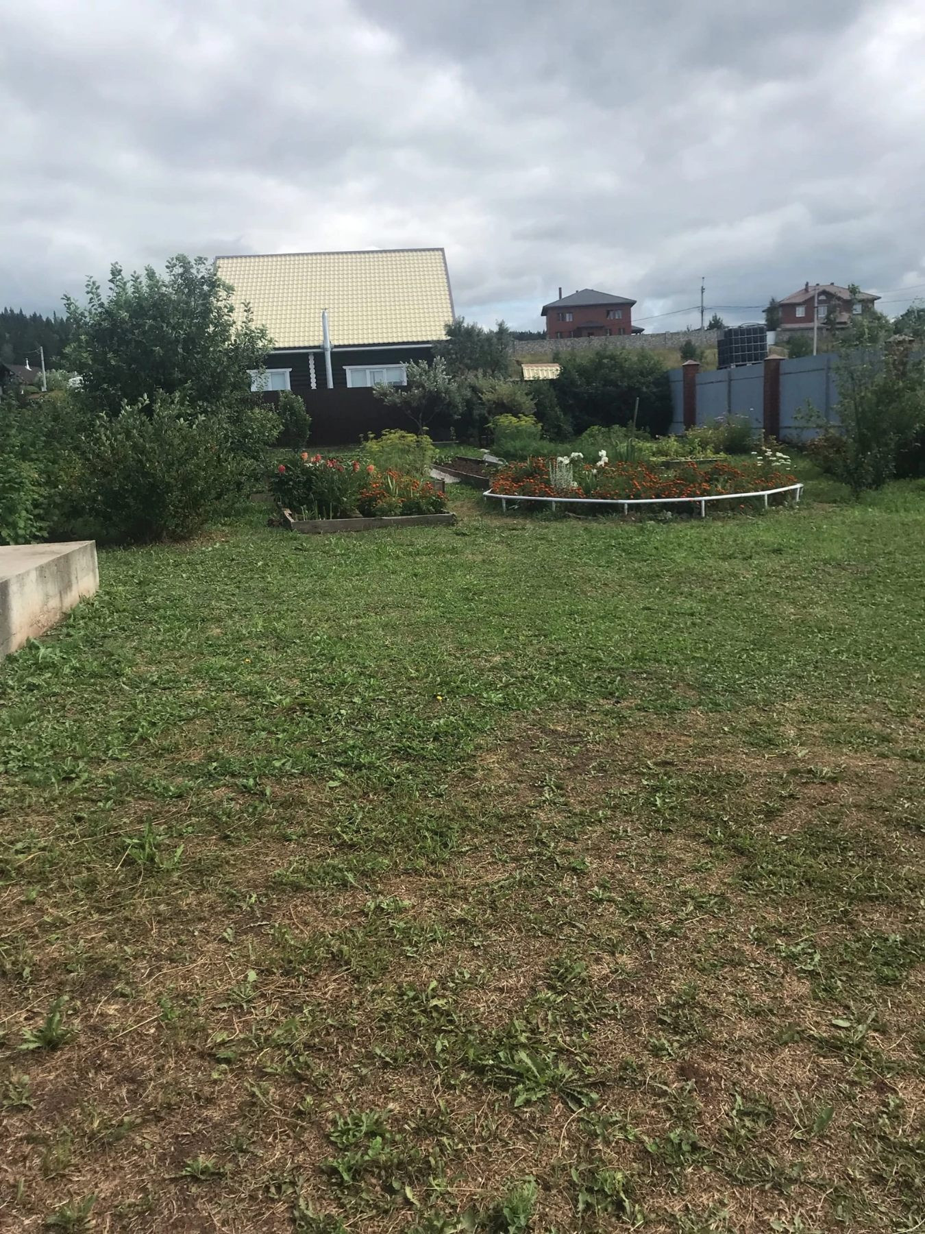 Участок  (15 соток) ровный - огорожен забором из профнастила, на участке есть гараж на две машины, фундамент под дом 9*12, две большие теплицы, саженцы — смородина, яблоня, груша, облепиха, огород ухоженный.