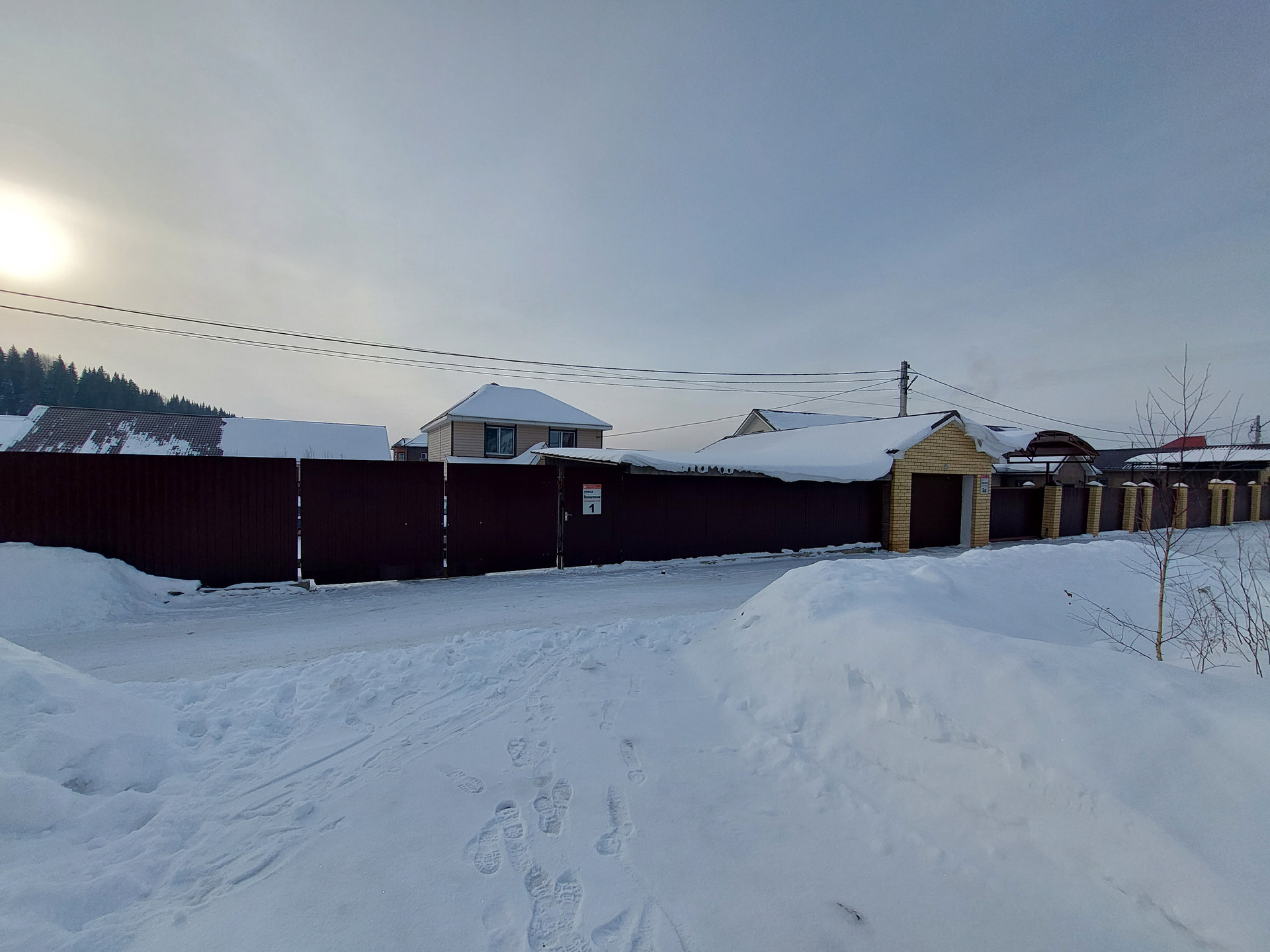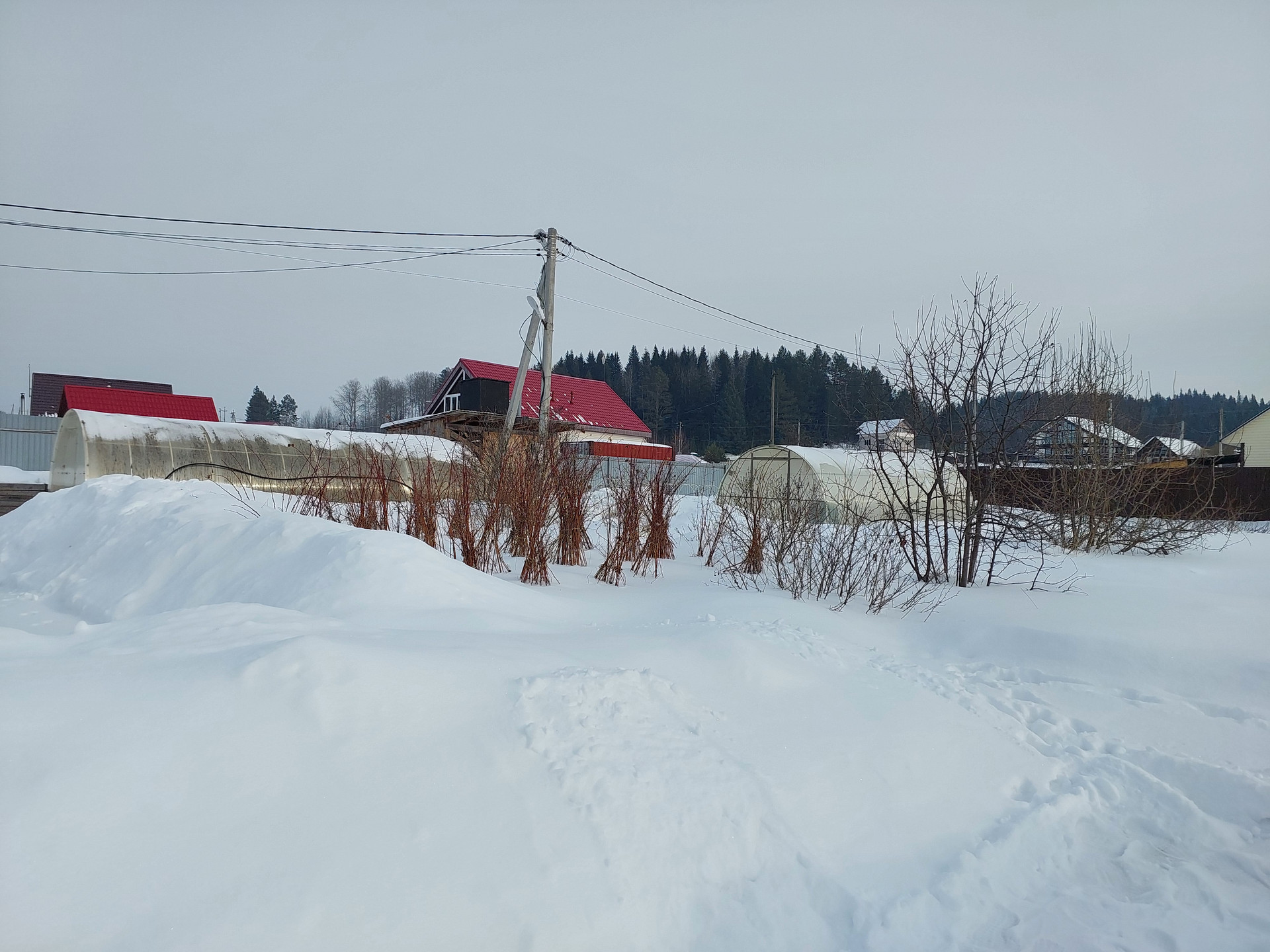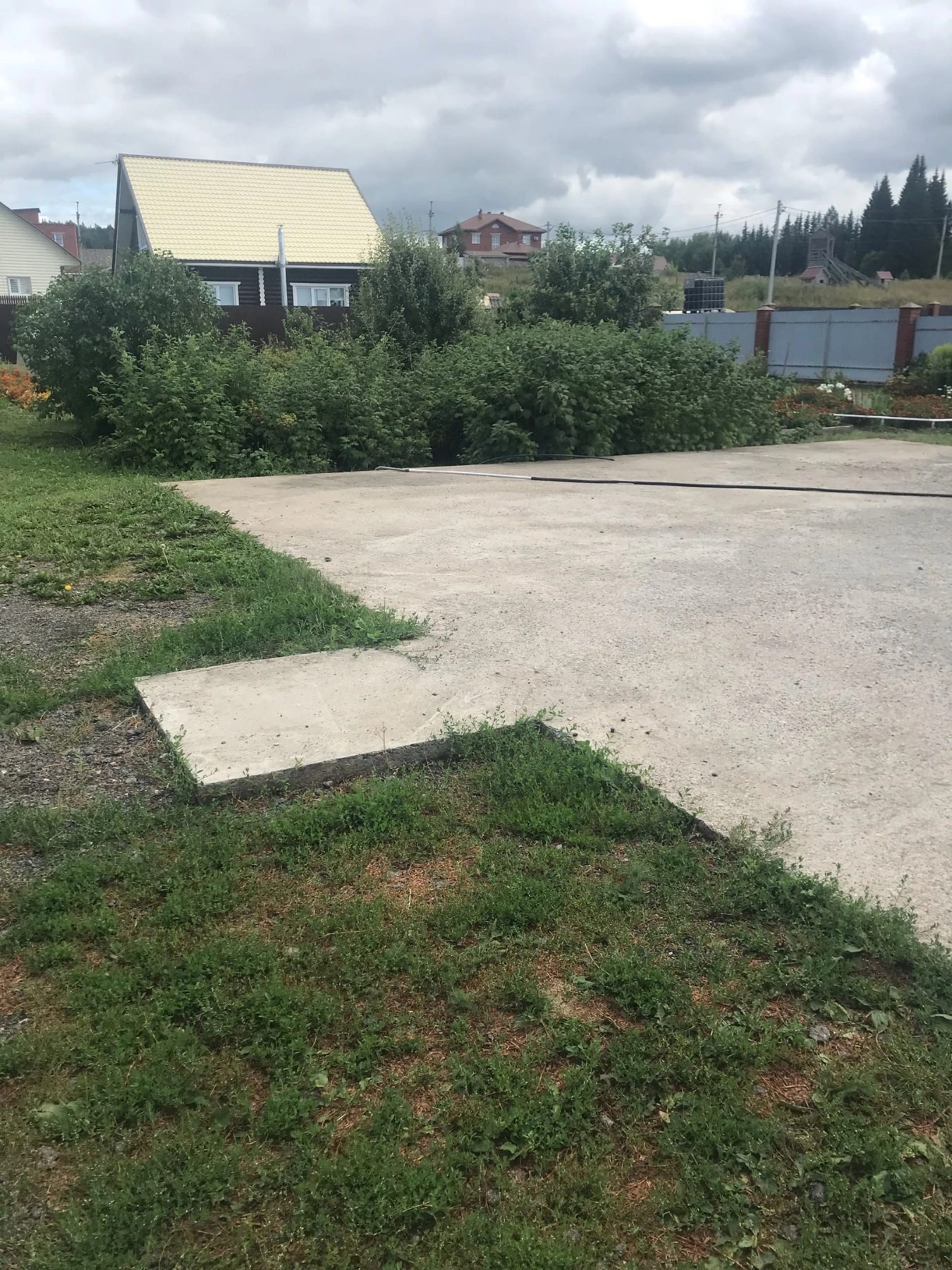 Участок  (15 соток) ровный - огорожен забором из профнастила, на участке есть гараж на две машины, фундамент под дом 9*12, две большие теплицы, саженцы — смородина, яблоня, груша, облепиха, огород ухоженный.