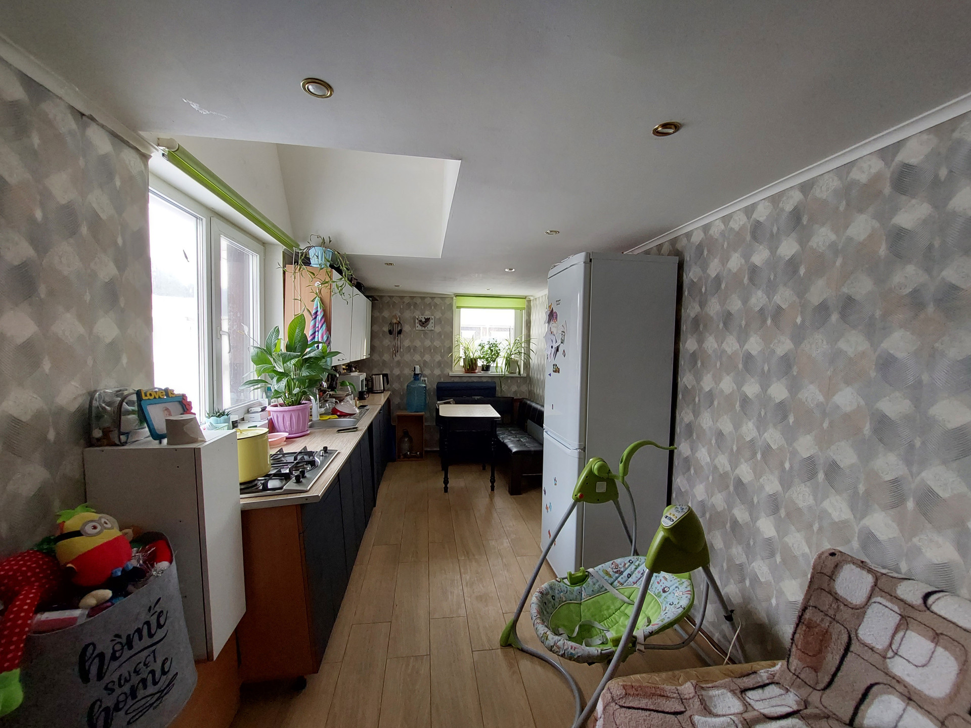По всему дому установлены стеклопакеты, на первом этаже на полу кафель (пол на первом этаже тёплый + в бане тоже тёплые полы и кафель), на втором этаже положен линолеум и ламинат.