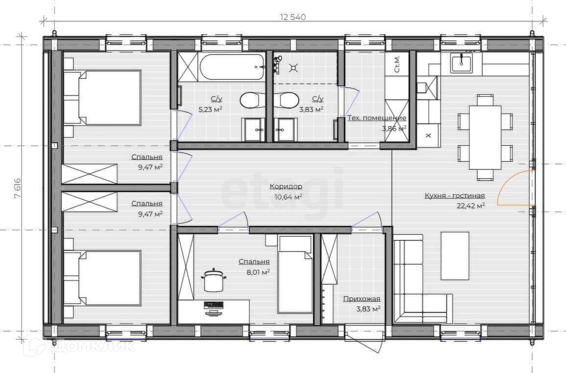 Планировка: Кухня-гостиная с видовыми панорамными окнами с выходом на терассу, 2 спальни, совмещенные туалет и ванная комната, техническое помещение и прихожая! Образец планировки есть в фото-описании объекта!