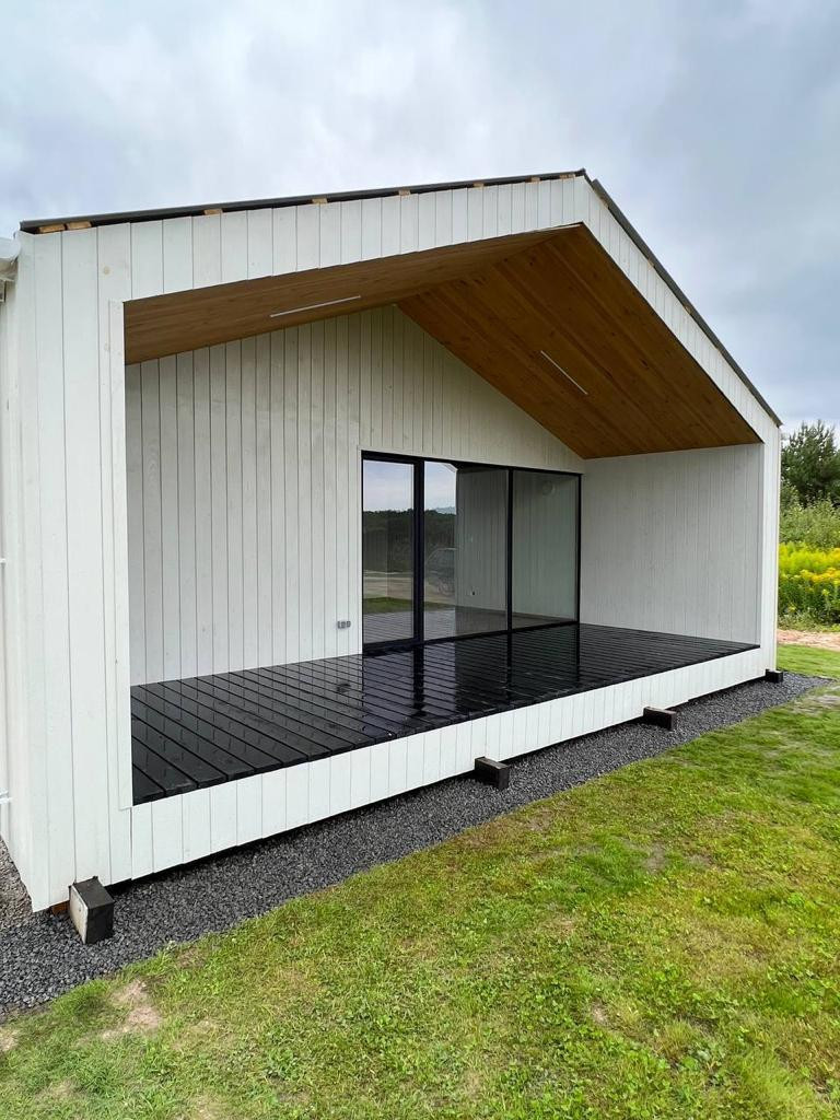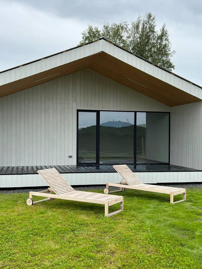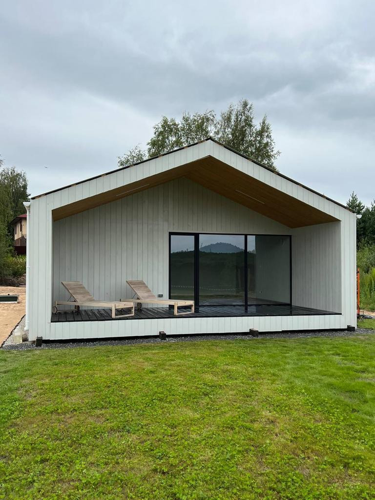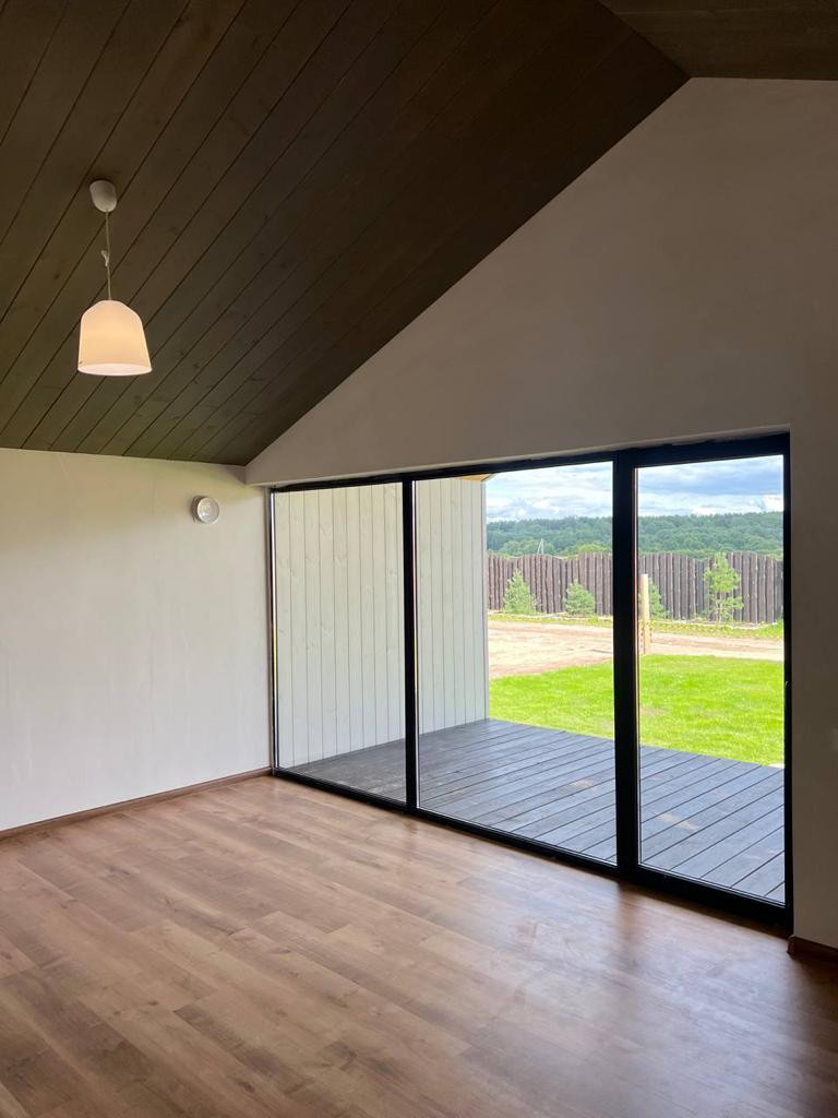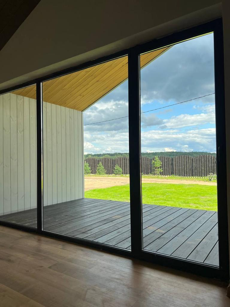 Кухня-гостиная с видовыми панорамными окнами и выходом на террасу,