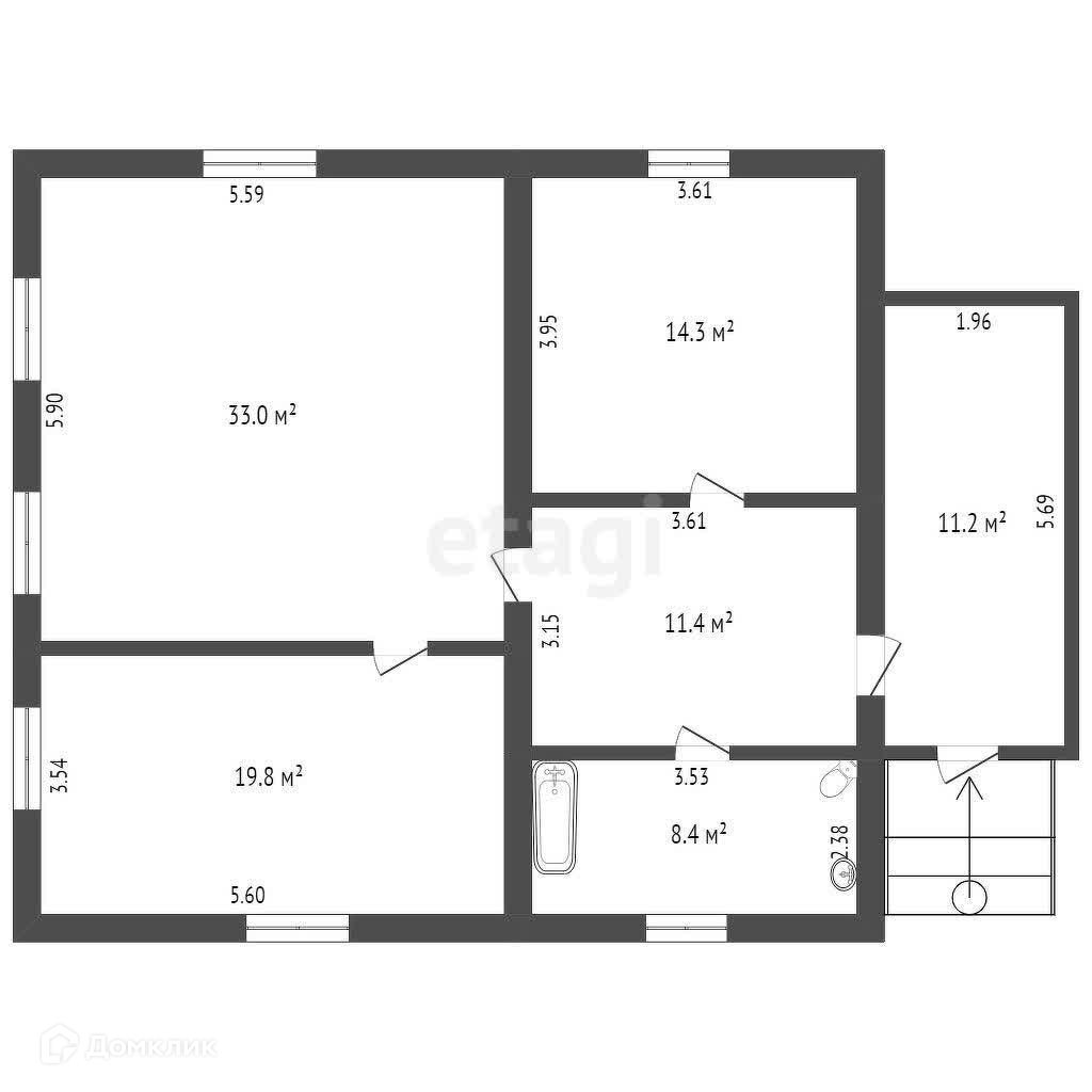 Площадь дома 86,9 квадратных метров, имеется подвал-цоколь площадью 86,9 квадратных метров.