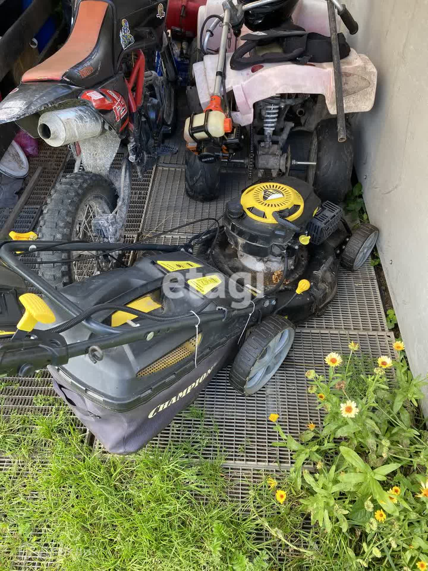 - шланги, бочки, лопаты, 3 газонокосилки.