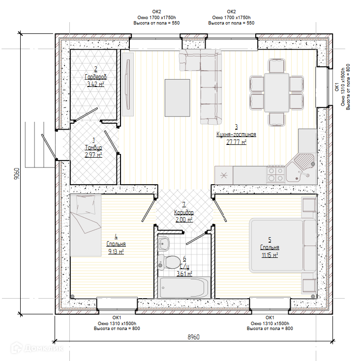 ● Kуxня-гостиная: 27,7 м²