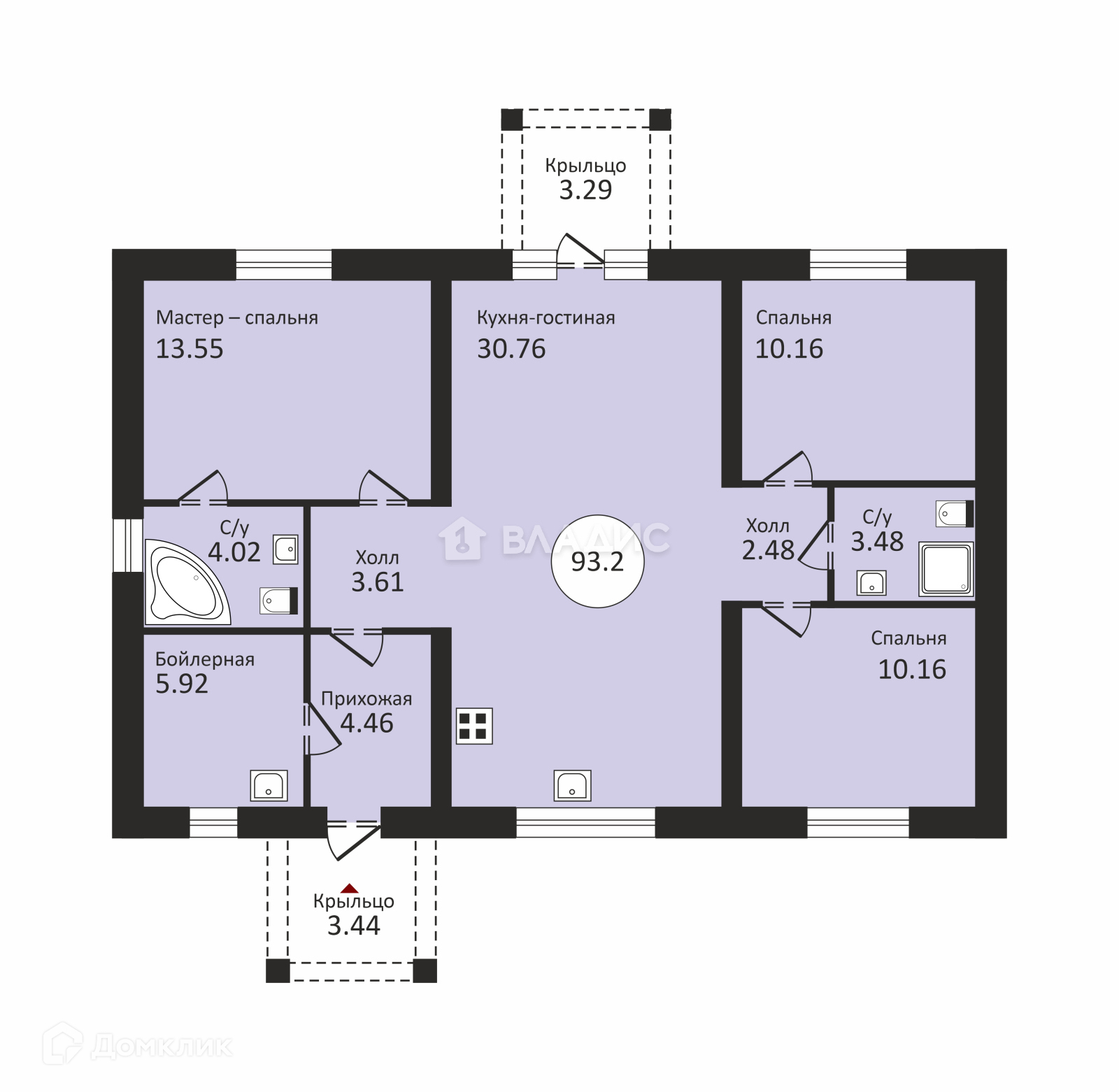 Благодаря хорошей планировке и грамотному распределению пространства, большая кухня - гостиная с панорамными окнами, высокими потолками и выходом на просторную террасу, разделяет дом на две отдельные части: родительскую с одной мастер – спальней с собственным санузлом, и детскую, с 2 отдельными спальнями и вторым санузлом.