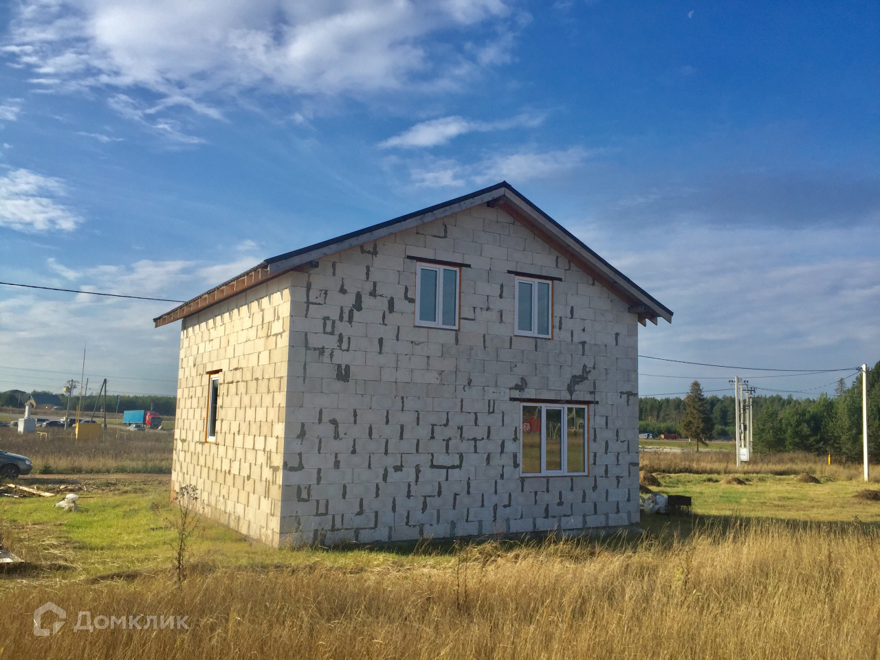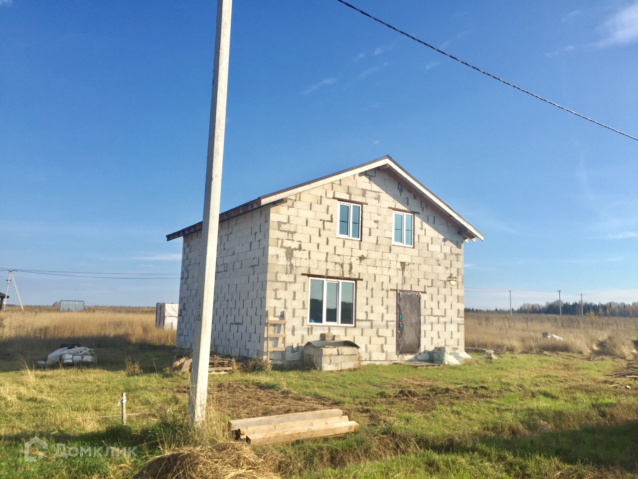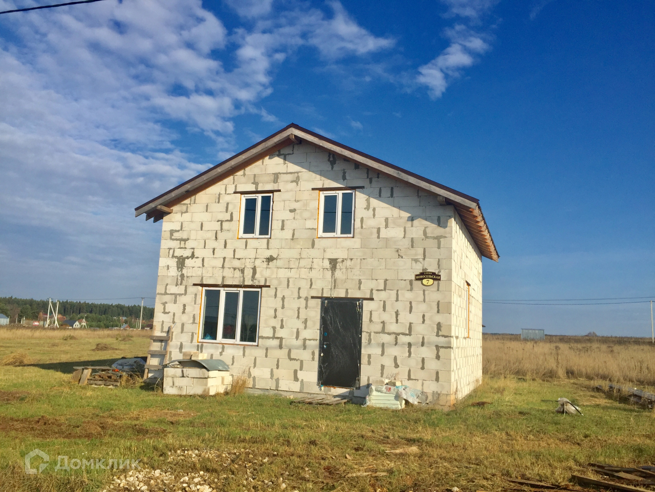 Фундамент плитный (300 мм.), стены-газосиликатный блок, крыша-металлочерепица, входная дверь- металлическая с терморазрывом, окна-пластиковые, межкомнатные перегородки первого этажа. Коммуникации заведены в дом: электричество 15 кВт (разводка по дому), скважина 30 м., канализация жб кольца. Возможен вариант предчистовой и чистовой отделки  "под заезд".  Деревня газифицирована, ГАЗ у дома (написано заявление на подвод газа к дому).