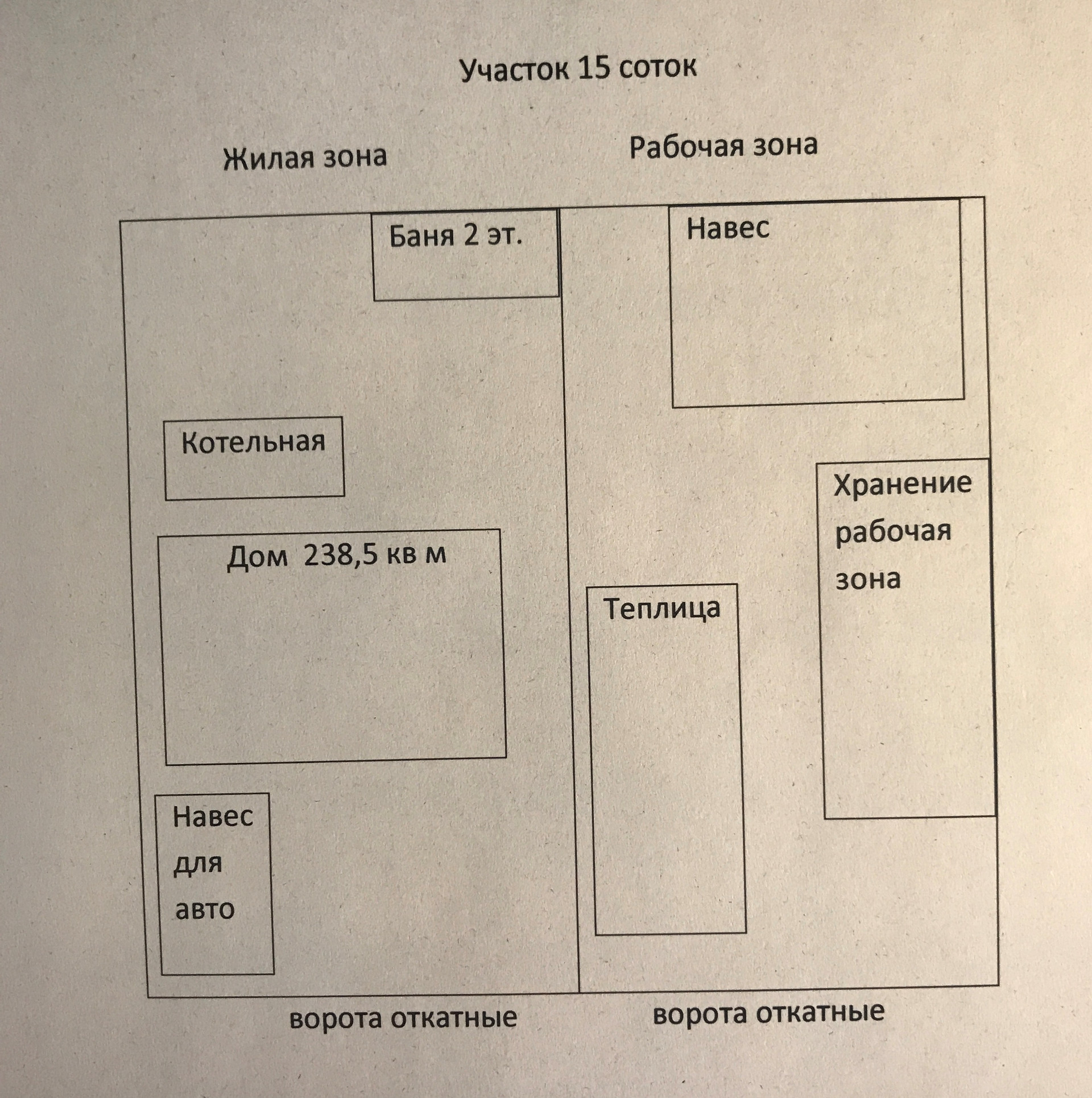 Участок 15 соток разделен на две части жилую и рабочую зоны (см.схему): жилая зона: навес для машин, парковка, дом, котельная (отдельное здание), баня два этажа, беседка. рабочая зона: теплица (используется круглый год), гараж для техники, хранение и рабочая зона.