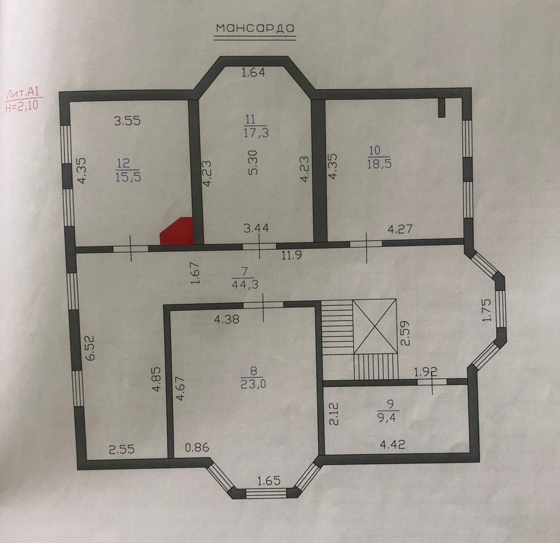 2этаж: комната 18,5квм, комната 17,3квм, комната 15,5квм, комната 23,0квм, санузел 9,4квм, свободное пространство 44,3квм. Высота потолков 2,7метра.