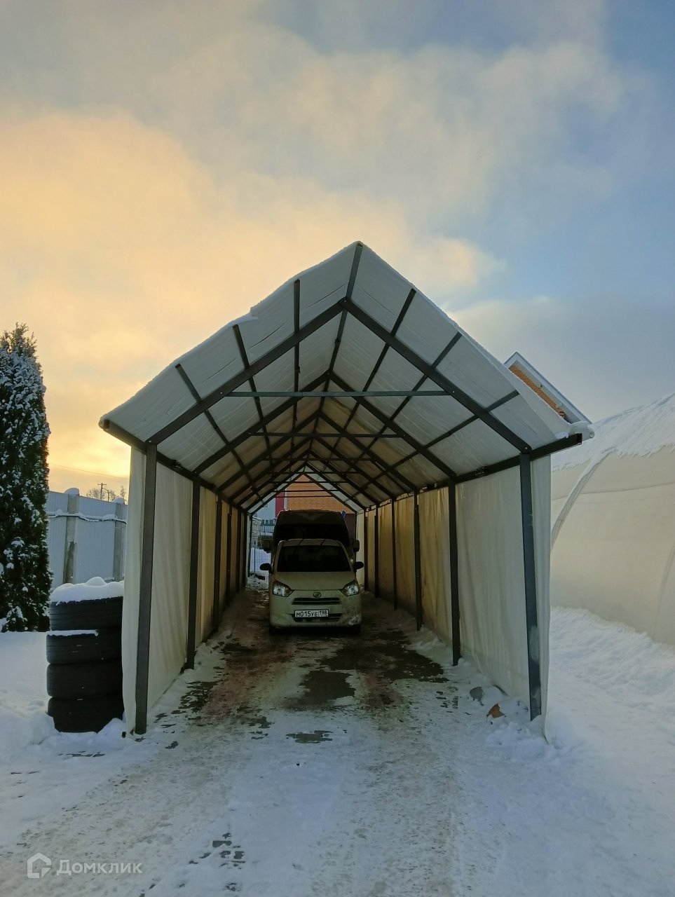 Во дворе сборно- разборный  на болтовых соединениях навес для автомашин, закрытый ПВХ пленкой вкруговую.