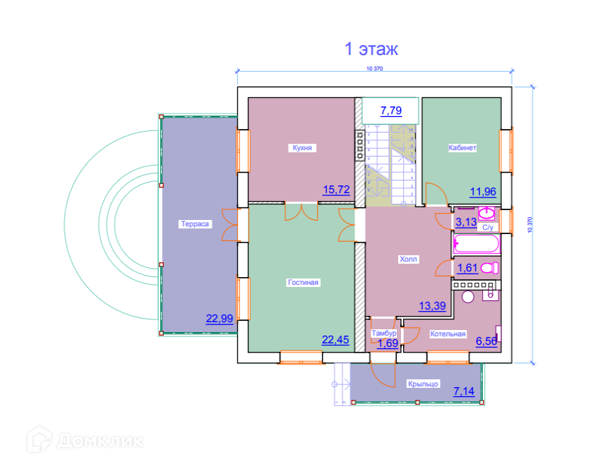 Первый этаж: тамбур, холл, гостиная, кухня, кабинет, санузел, котельная
