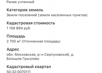 Продаётся земельный участок 15 соток в дер. Большое Грызлово, Московской области, г.о Серпухов. Собственник. Свет и ГАЗ по границе, есть водонапорная башня. В шаговой доступности автобусы до города Пущино и Серпухов, магазин Пятерочка, Wildberries. Так же есть общеобразовательная школа ( 11 классов) , детский сад. Очень развитая инфраструктура, мног... |