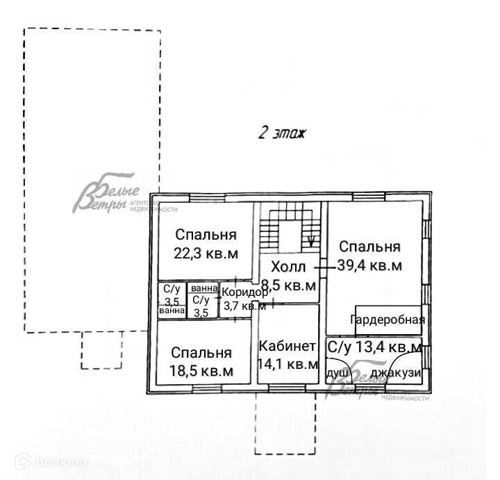 2-ой этаж: спальная 22.3 кв.м, спальная 39.4 кв.м, спальная 18.5 кв.м, кабинет 14.1 кв.м, гардеробная 13.4 кв.м, коридор 3.7 кв.м, холл 8.5 кв.м..