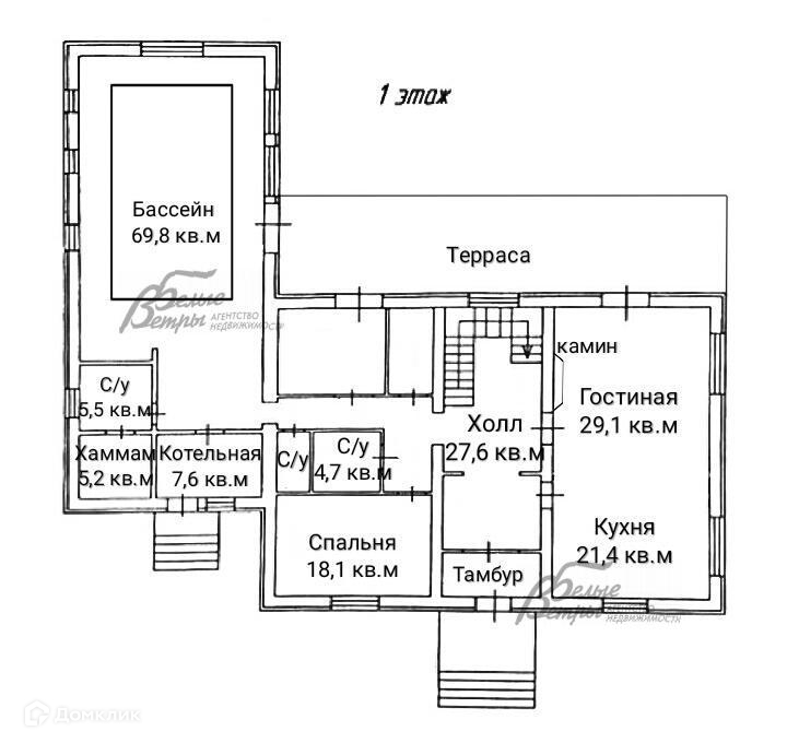 1-ый этаж: бассейн с чашей 7х3 м (скиммерный, глубина 1,66 м) 69.8 кв.м, душ 5.5 кв.м, сауна 5.2 кв.м, гостиная 29.1 кв.м, кухня 21.6 кв.м, холл 27.6 кв.м, спортзал 10.9 кв.м, спальная 18.1 кв.м, санузел 2.2 кв.м, санузел 4.7 кв.м, коридор 5.0 кв.м, санузел 4.4 кв.м, котельная 7.6 кв.м, тамбур 5.0 кв.м..