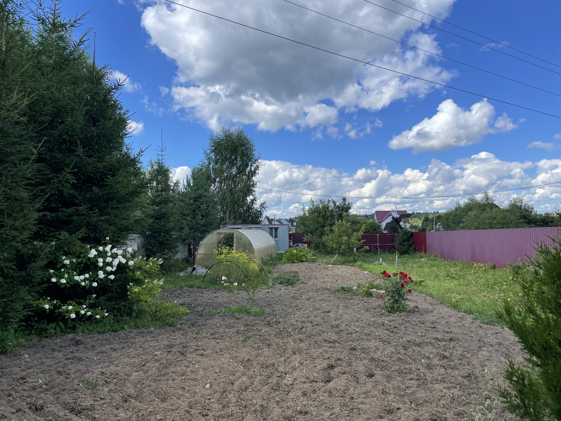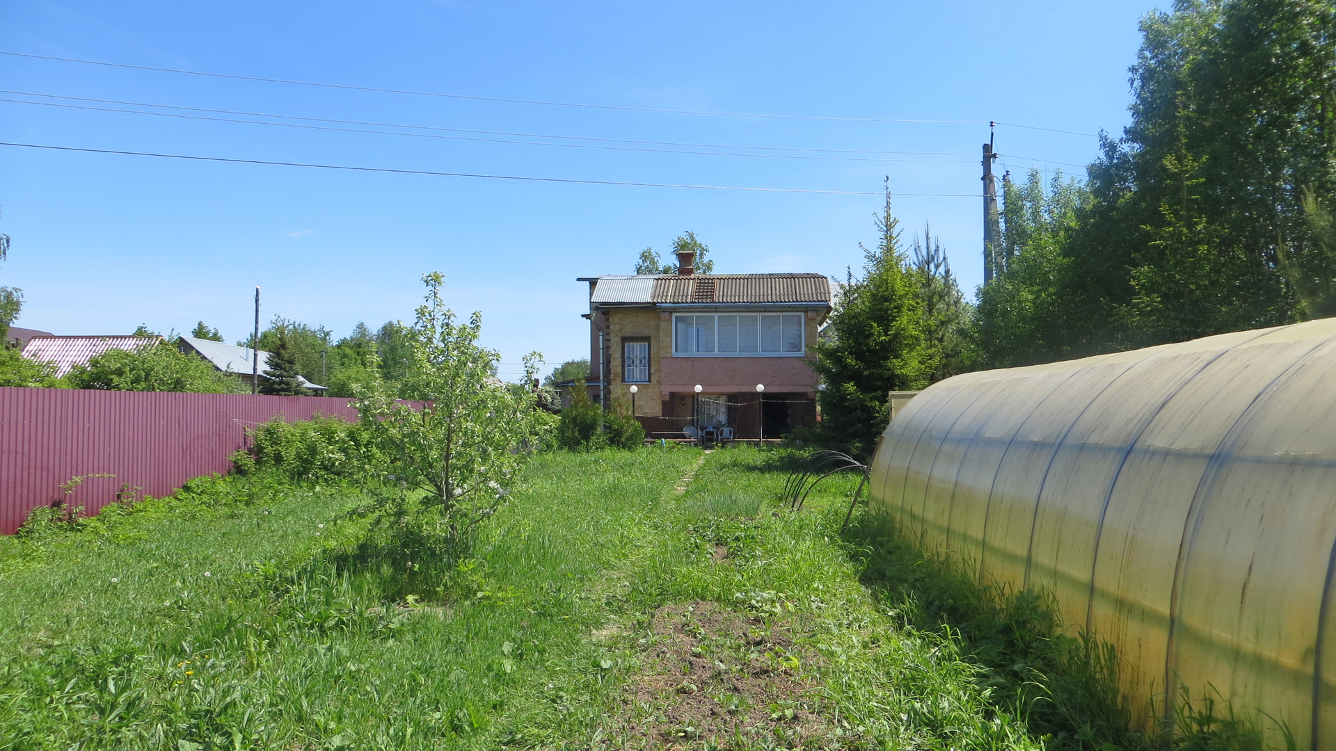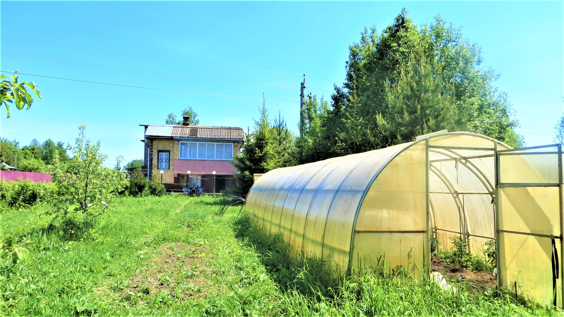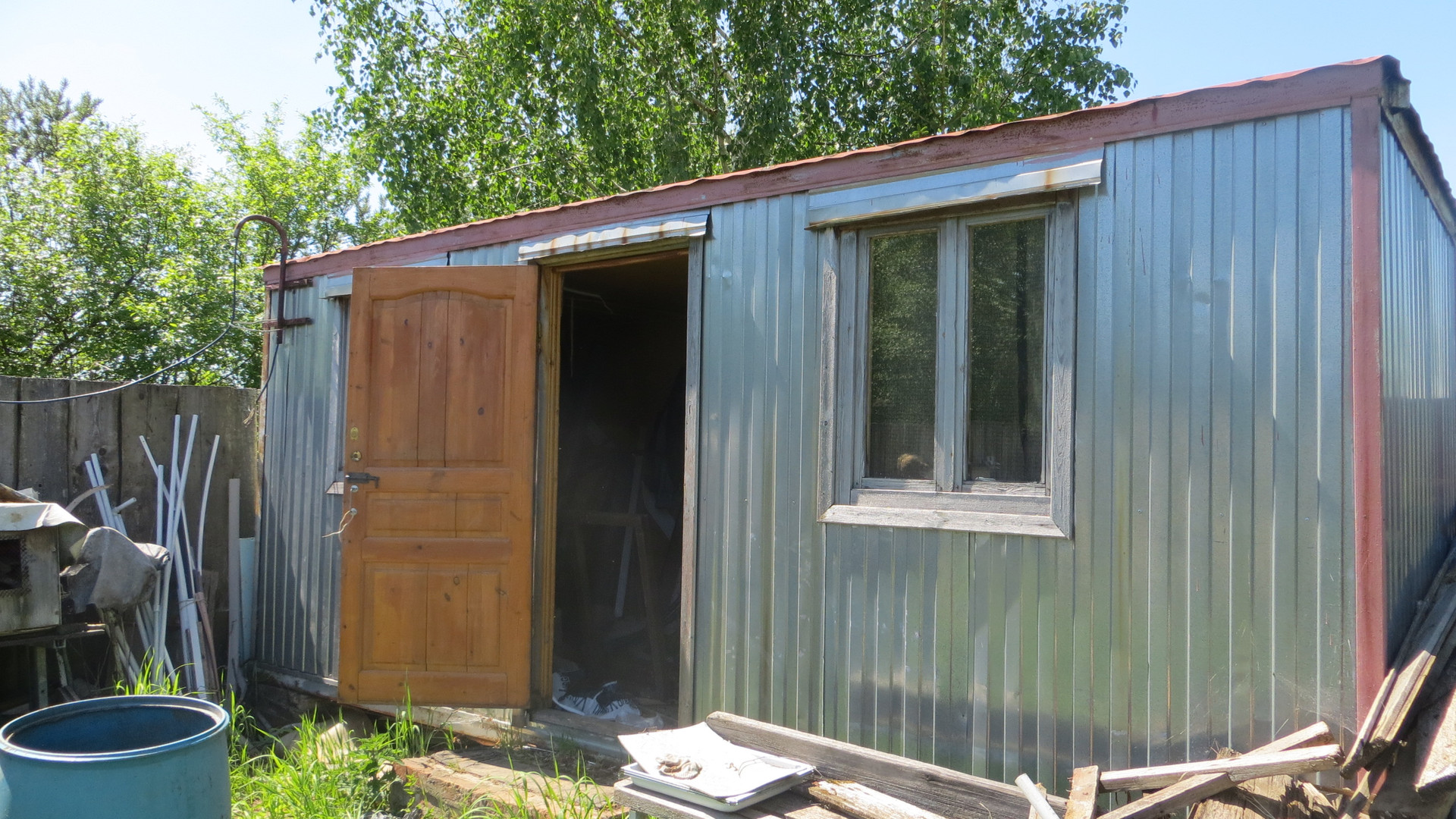 На участке большая теплица и оцинкованная бытовка на фундаменте 6х2,4 м.
