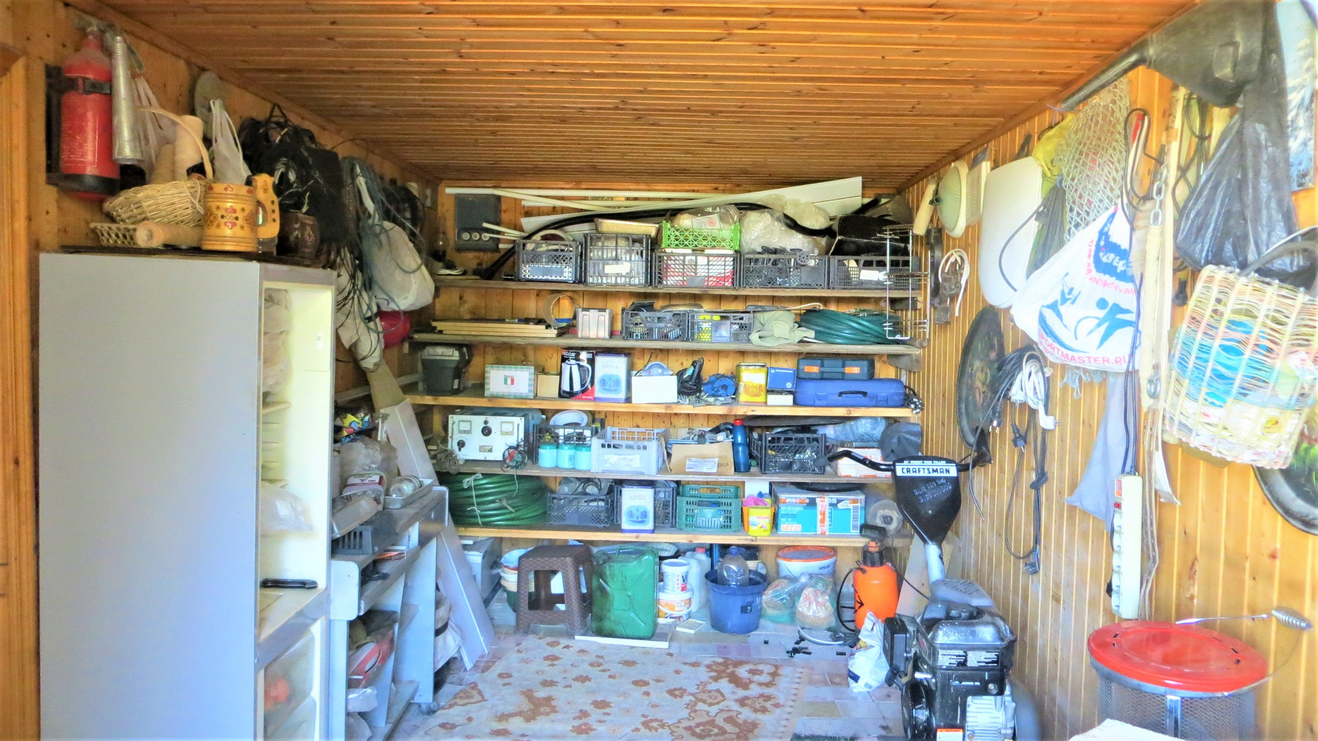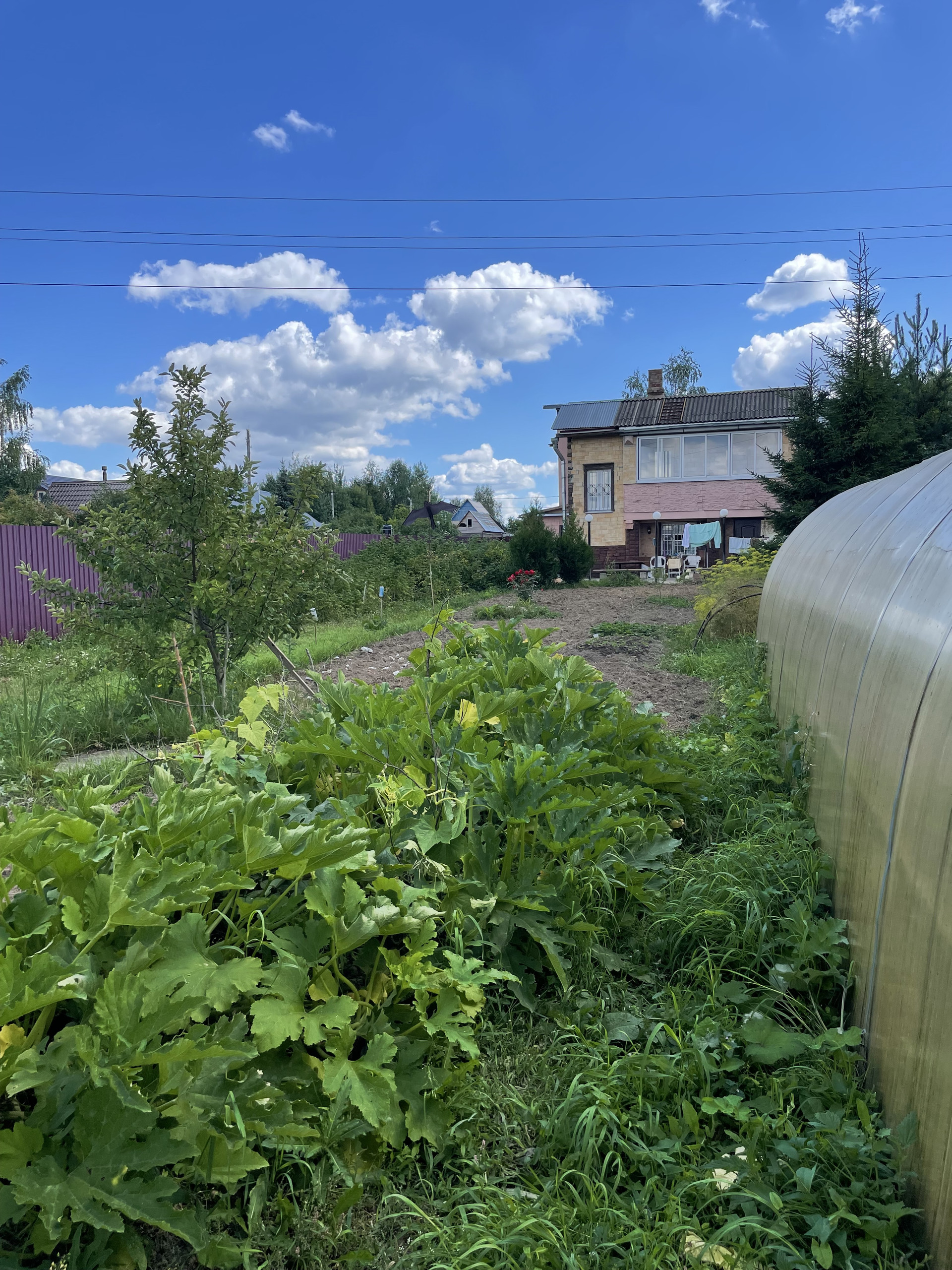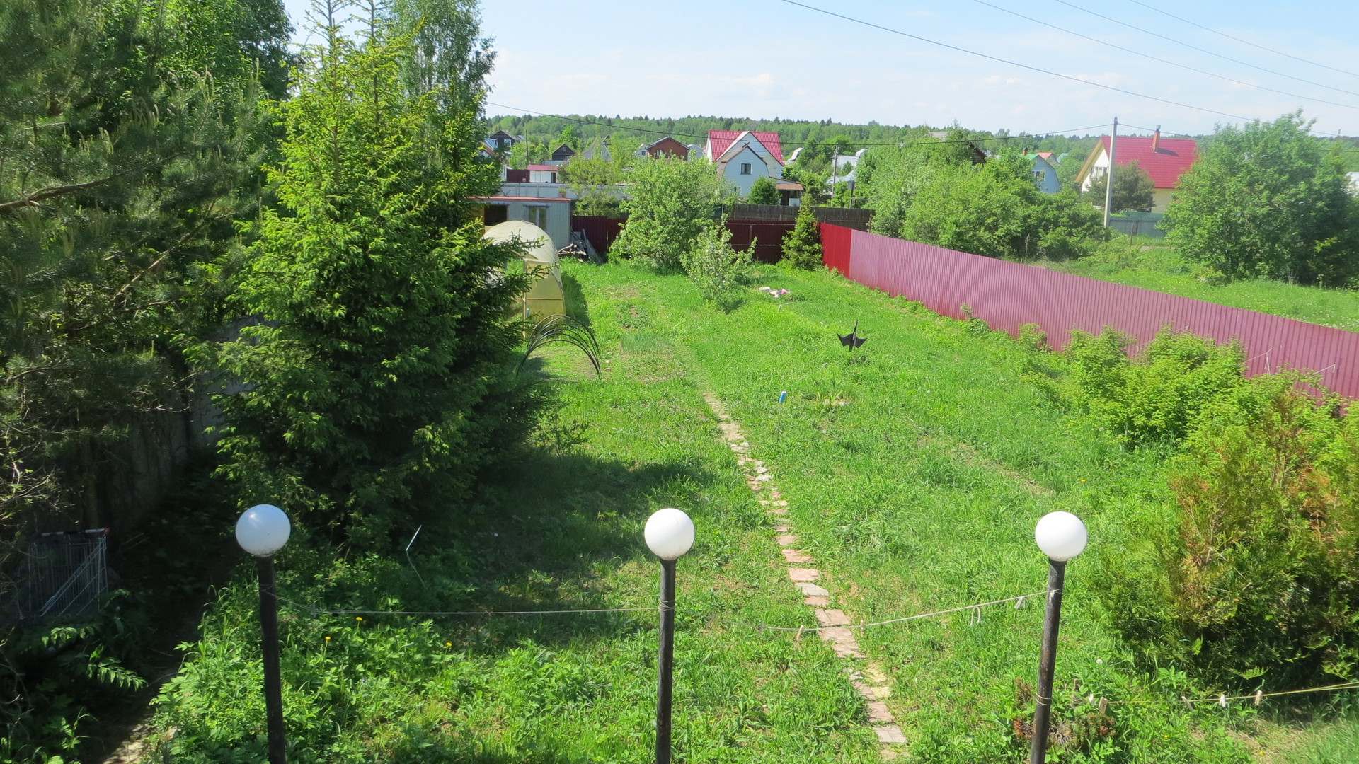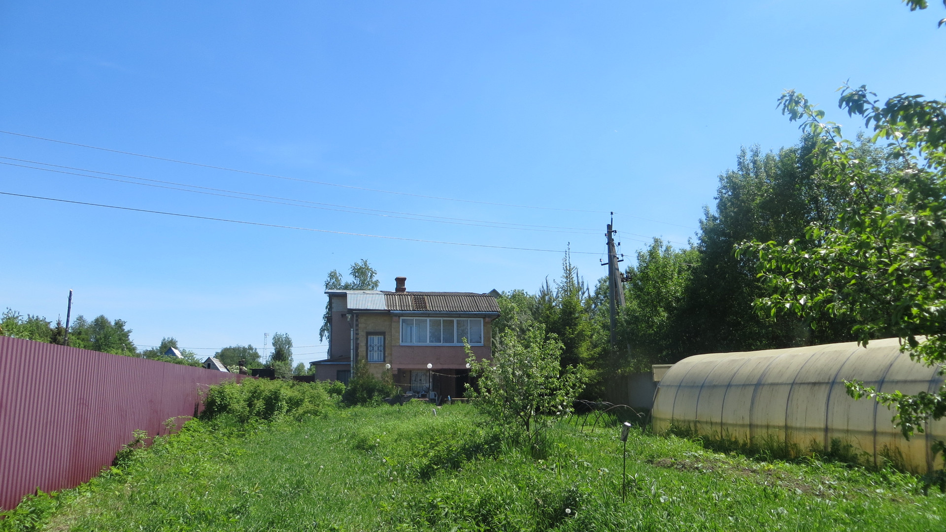 На участке большая теплица и оцинкованная бытовка на фундаменте 6х2,4 м.