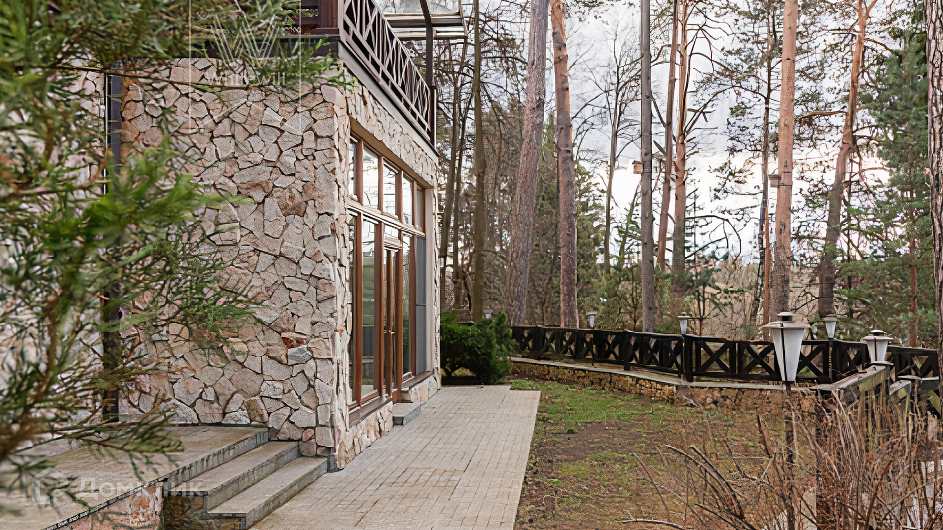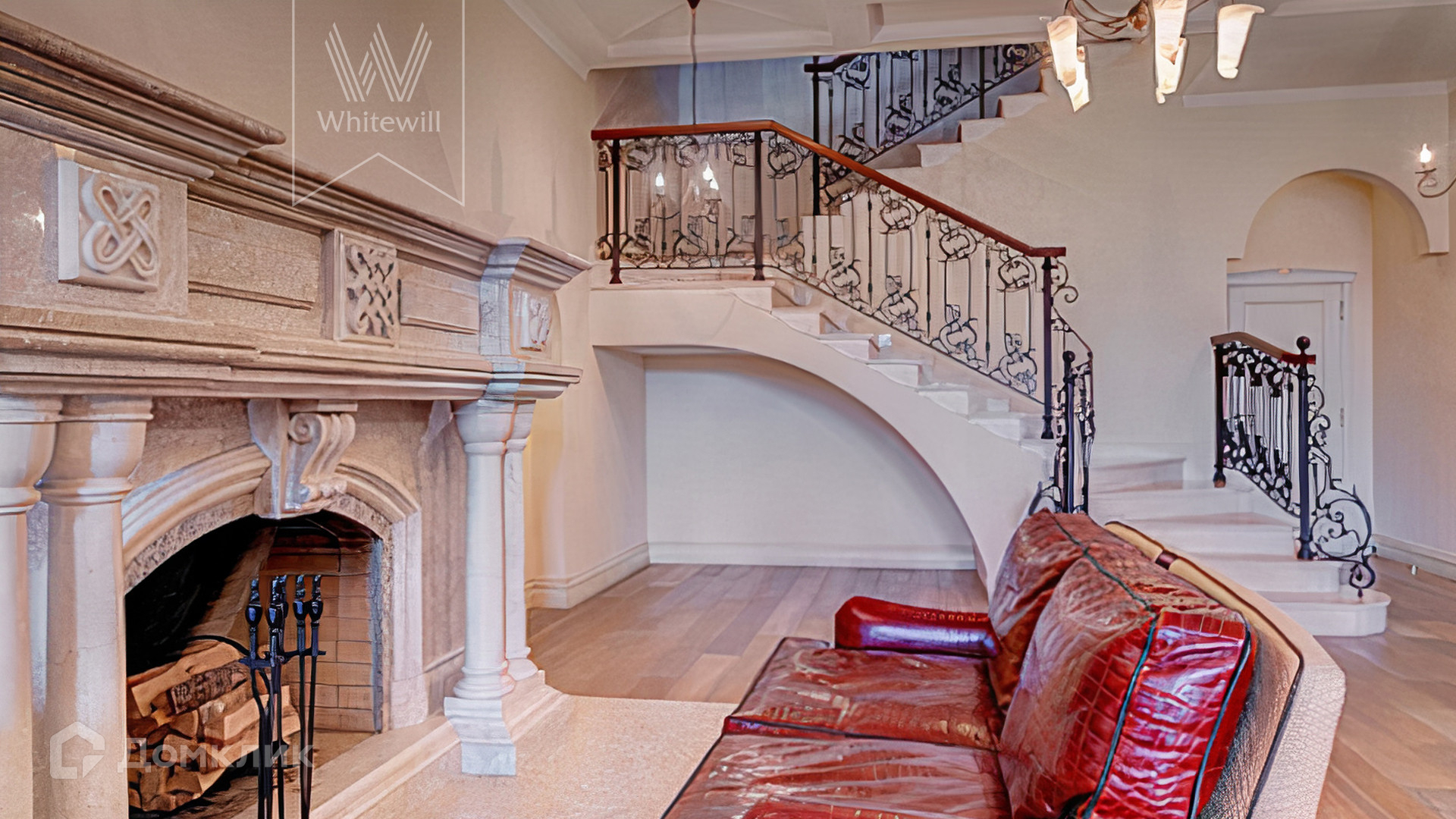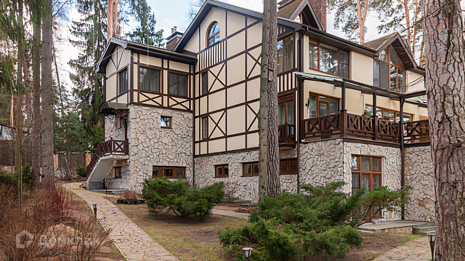 ID 11 132. Большое Сареево. Загородный дом площадью 1000 м² построен на лесном участке 18 соток. Фасад облицован бежевой штукатуркой, декорирован темными контрастирующими балками и камнем по цоколю. Лаконичный интерьер оформлен в кремовых оттенках, создающих атмосферу тепла и уюта. В резиденции спланировали 6 спален, каминный зал, кухню-столовую, кинотеатр, бильярдную, библиотеку и SPA-зону с бассейном и сауной. Рядом с основным домом построен гараж на 2 машины с квартирой для персонала. На участке выполнен ландшафтный дизайн, вымощены дорожки, установлено уличное освещение.