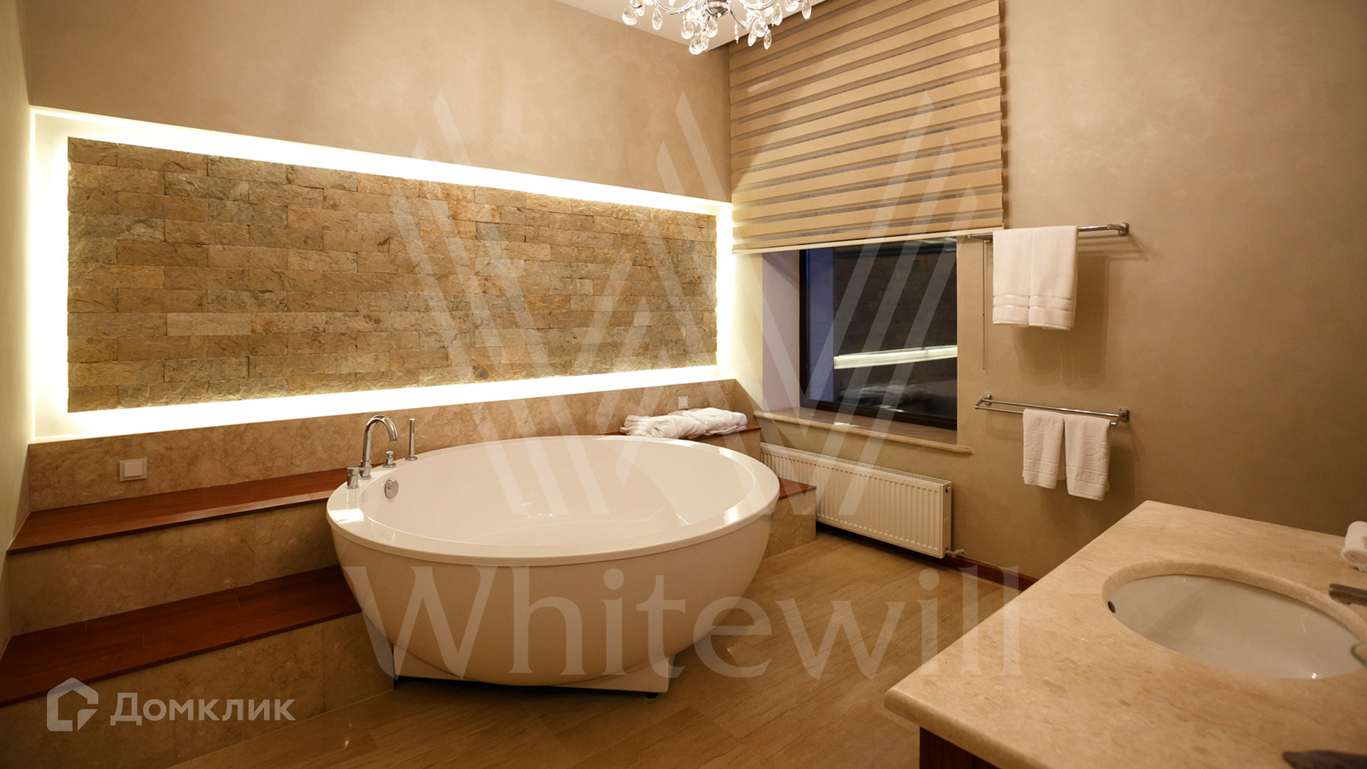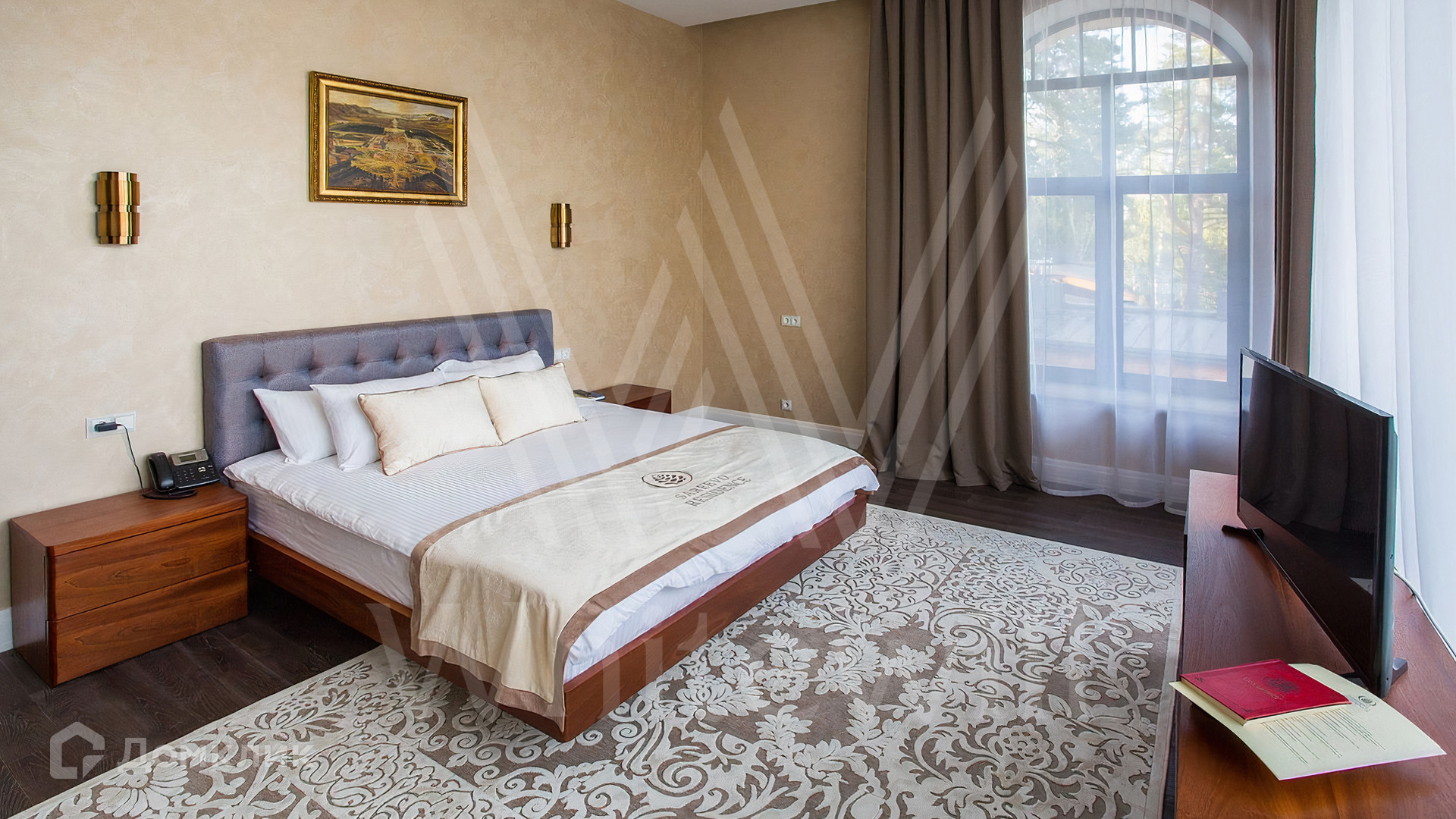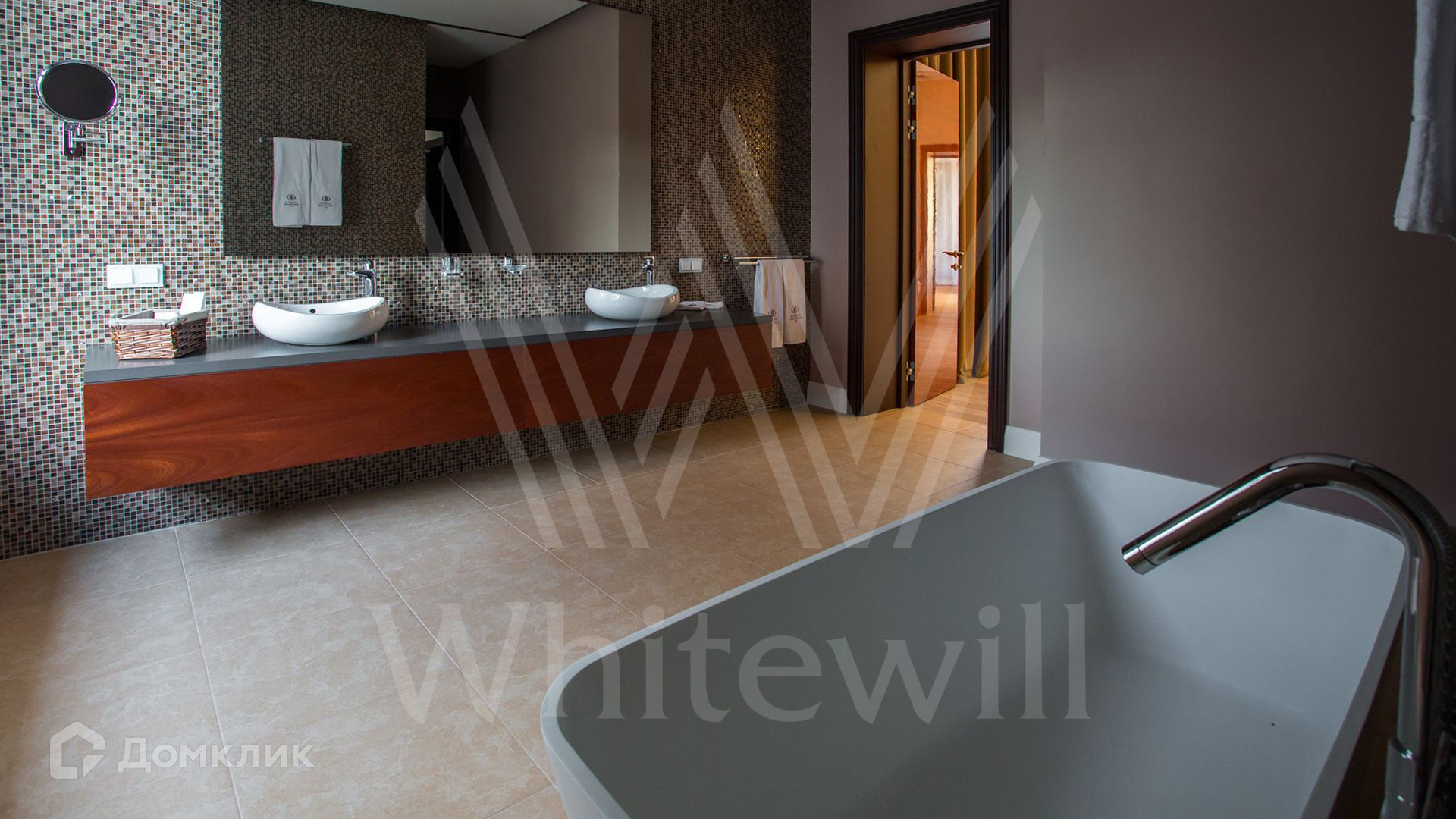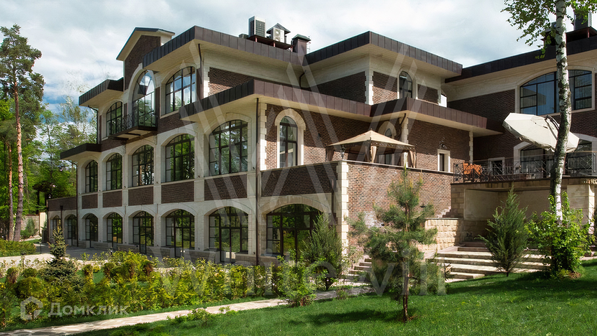 ID 11 342. Большое Сареево. Загородный ансамбль из трех корпусов общей площадью 2900 м² построен на просторном лесном участке 3 гектара. Фасады зданий выполнены в европейском стиле и облицованы светлым камнем и коричневым клинкерным кирпичом. Современный интерьер сочетает элементы классики и лофта, в отделке использованы теплые оттенки. В каждом из корпусов расположены 5 спален, SPA-зона с бассейном, сауной и хаммамом и кухня. Территория с ландшафным дизайном, расположенная на склоне холма, включает парковую зону с прогулочными мостами, верандами и террасами для отдыха, а также мини-зоопарк и ферму. На участке предусмотрены дом для гостей 200 м², детский домик 300 м², дом для охраны 100 м², охотничий домик 50 м² и подземный паркинг.
